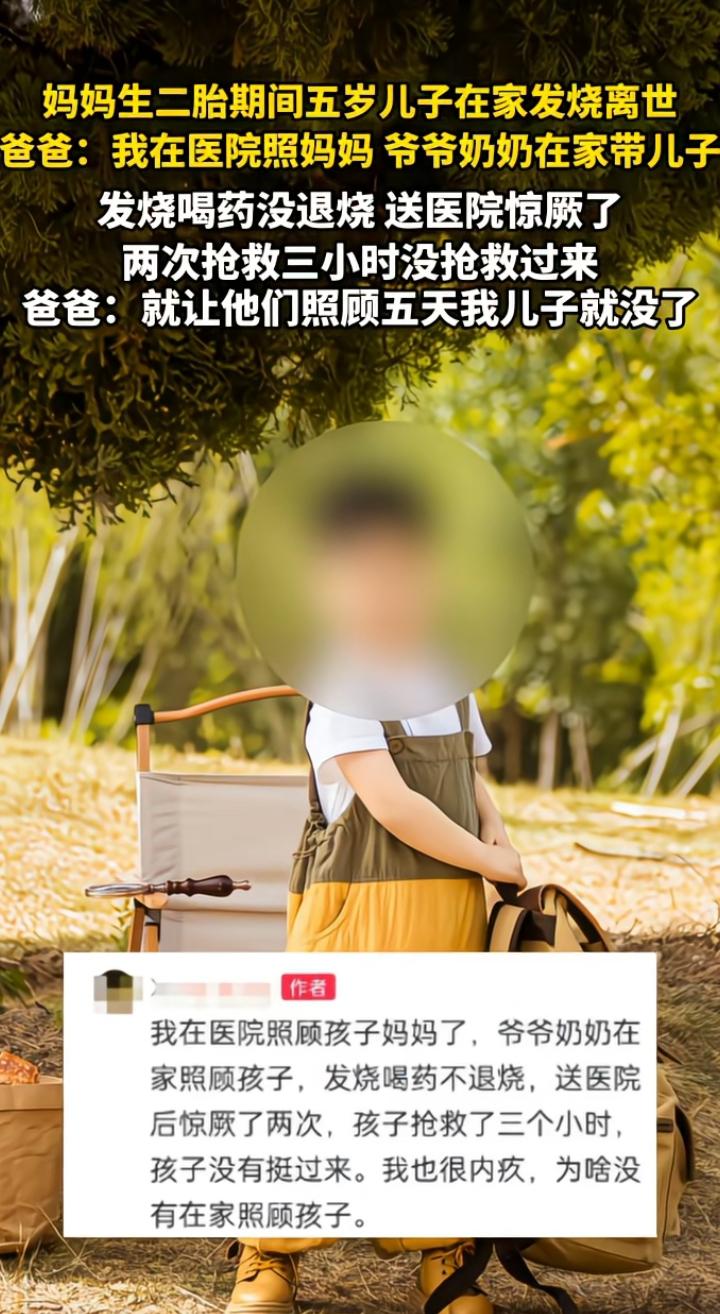 做父母的看到这新闻都会心痛吧!才五岁的孩子,还没来得及好好看一眼这个世界,谁能想到,一场发烧,没能救的过来…… 让爷爷奶奶带了五天,孩子没了,爸爸在医院照顾生二胎的妈妈,爷爷奶奶带着他,发烧后吃了药没退烧,送到医院后已经晚了,没抢救过来。爸爸懊悔不已,后悔为什么没把孩子带在身边,没想到短短五天,和孩子天人永隔了 评论区最多的就是骂爷爷奶奶不负责任的,说不是自己生的,哪怕是亲孙子,也可能不在意,怎么样也比不上父母照顾的上心的。 但很多人理性的想到了,最近肆虐的甲流,已经夺去不少人的生命了,之前新闻报道过,可能是甲流当成了普通感冒,吃药没用,再送医院就晚了。 现在最伤心的就是孩子的父母了,他们陷入了无尽的痛苦和自责中,后悔为什么不把他带在身边,或者自己能在家照顾一下他,他们肯定一遍遍的在想,假如那么做了,孩子是不是还在? 再后悔都已经晚了,只能说这件事又给大家一个警醒,有感冒症状及时就医,尤其是孩子,以防是甲流用药不当,孩子的身体抵抗力怎么也比不上大人的。 愿孩子在天堂一切安好[祈祷][祈祷][祈祷] 图片及素材源自网络