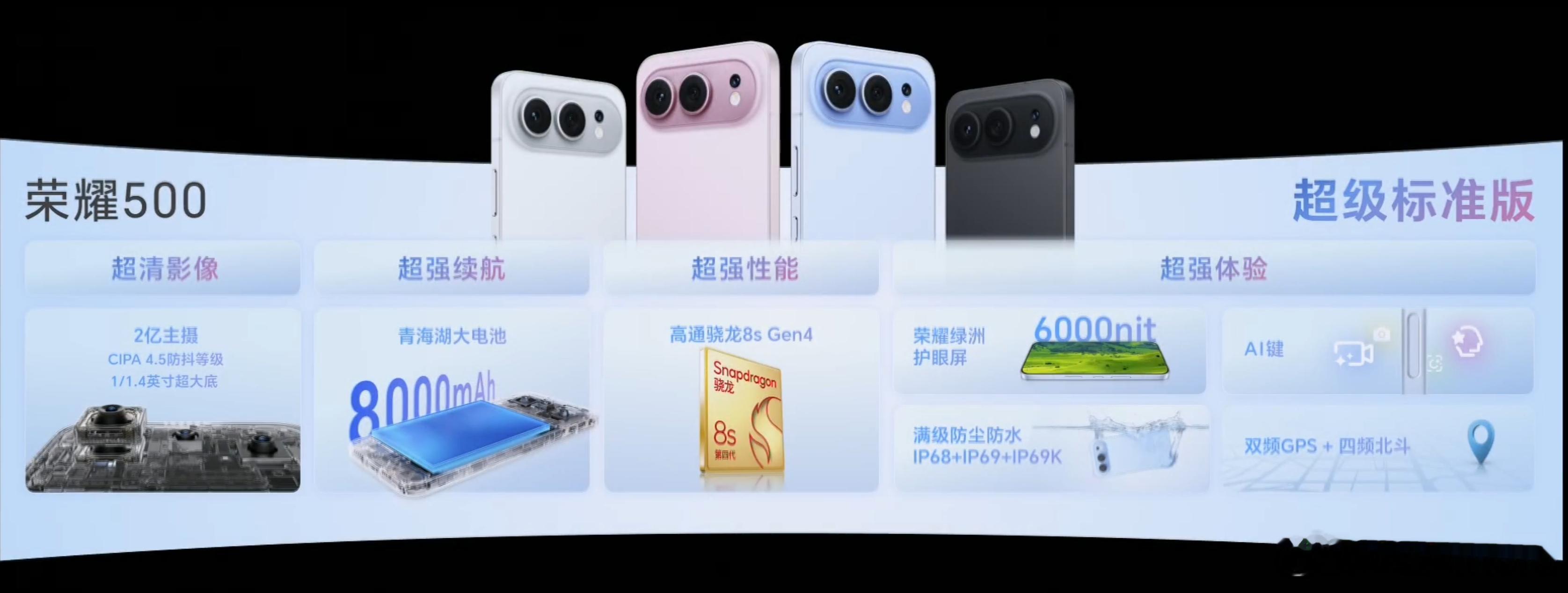 荣耀500价格出来了,12+256,269912+512,299916+512,3299规格:骁龙8s Gen4,6.55英寸2736*1264p 1.5K 120Hz LTPS直屏,前置50MP,后置200MP HP3 1/1.4 OIS主摄+12MP超广,80W+8000mAh,金属中框+玻璃后盖,短焦指纹,双扬声器,USB2.0,双频GPS+四频北斗,E2能效芯片,IP68/IP69/IP69K满级防水。感觉咋样?