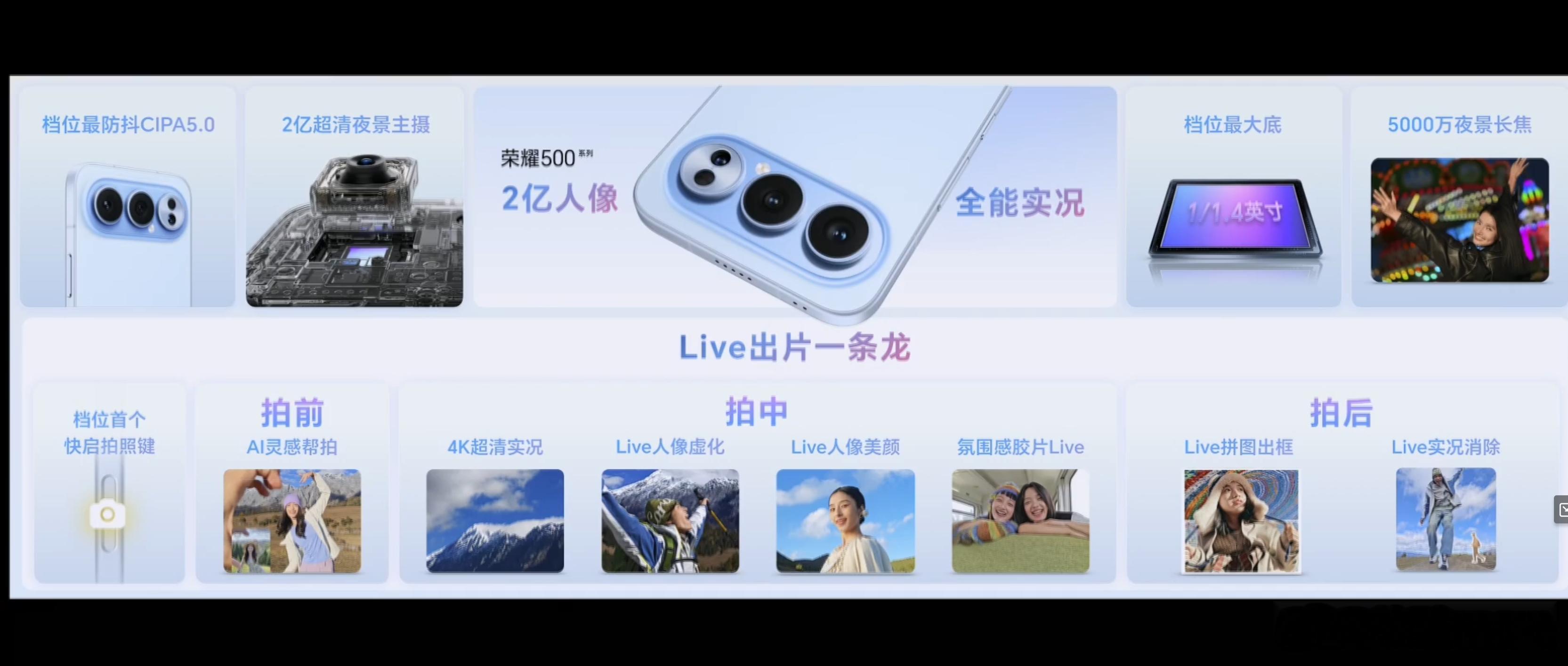 我很喜欢这次荣耀500系列的产品定义,有很长的长板,续航和性能。80W+50W+8000mAh的续航组合,领先友商竞品一大截,8000mAh能给你满满的安全感,放肆玩放肆拍也不用担心电量。全系搭载骁龙8系旗舰芯片,荣耀500 Pro更是搭载骁龙8 Elite,同档最强性能,打破潮流轻薄旗舰性能差的刻板印象。这次影像也有很惊喜的玩法,2亿人像Live实况,更清晰,还有出框玩法,一拍二拼三出框,完全打到我的心巴上,这不得在朋友圈收获一大波赞。可以说荣耀500系列在性能和体验上提升至旗舰水准,我很喜欢荣耀从用户出发,不吝啬性能和堆料的态度。