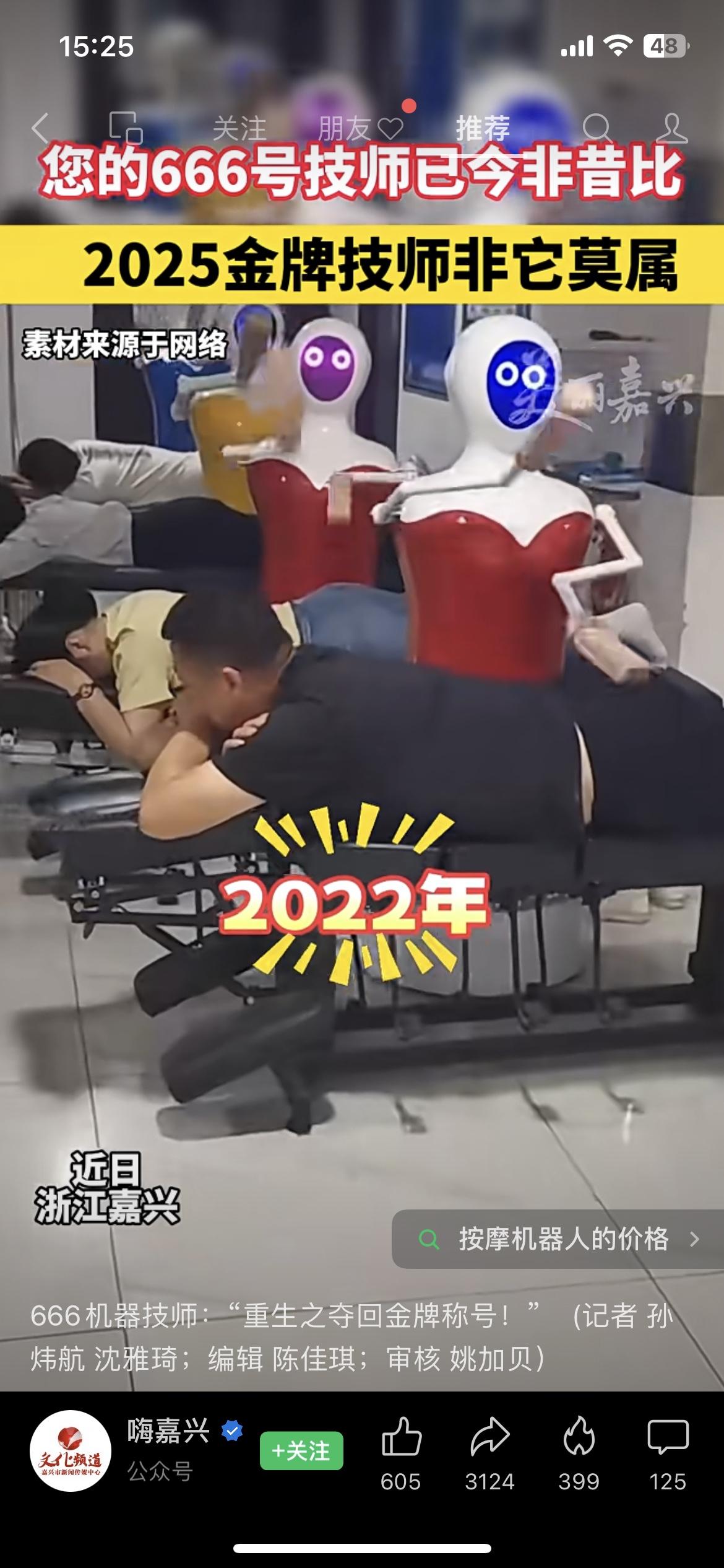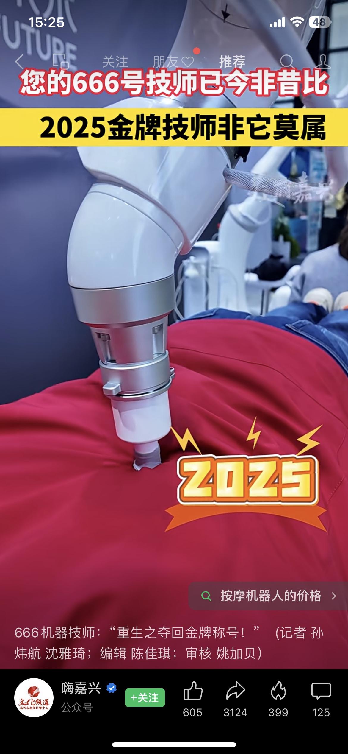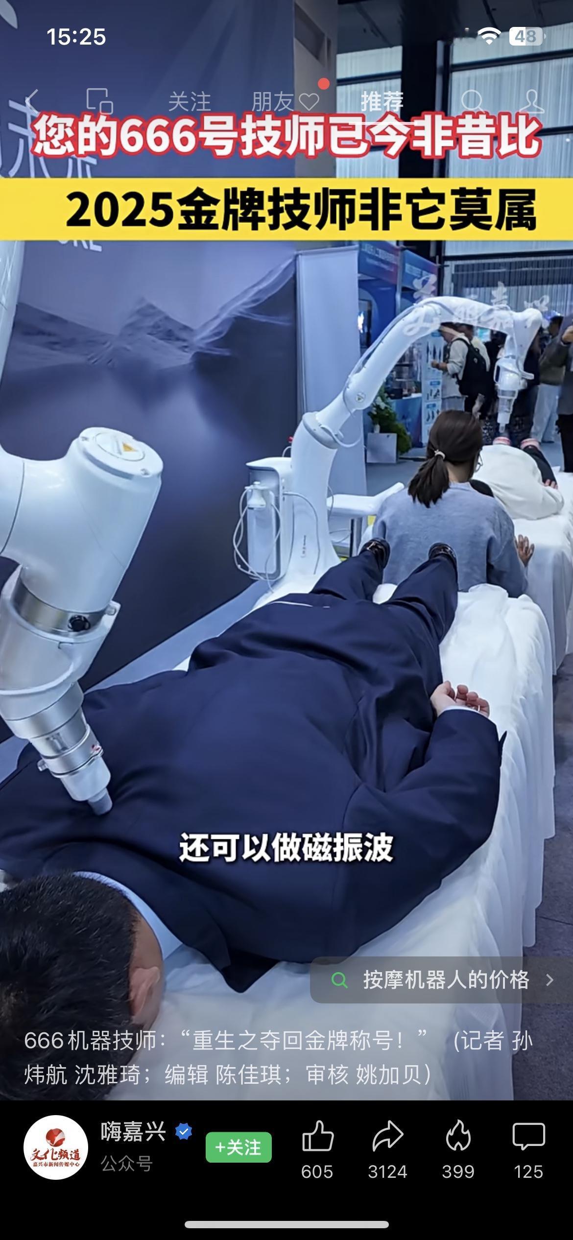 666号技师”失业警告!这机器人按得比人爽,还能做磁振波,以后按摩店要换老板了? 嘉兴展会上这台“机器人技师”,直接把现场人看傻了: • 机械臂精准捏肩揉背,力度比老技师还稳; • 不光能按摩,还能做磁振波理疗,躺上去连“养生”都省了; • 有人体验完说:“比我常点的666号按得舒服,关键不用等钟”。 网友直接炸了: “以后技师要转行?那我办的卡岂不是没用了” “机器按得再准,也没‘师傅唠嗑’那味儿啊” 你们觉得:这机器人能取代真人按摩不?以后按摩店会变成“机器人流水线”吗?消费级机器人 机器人技师