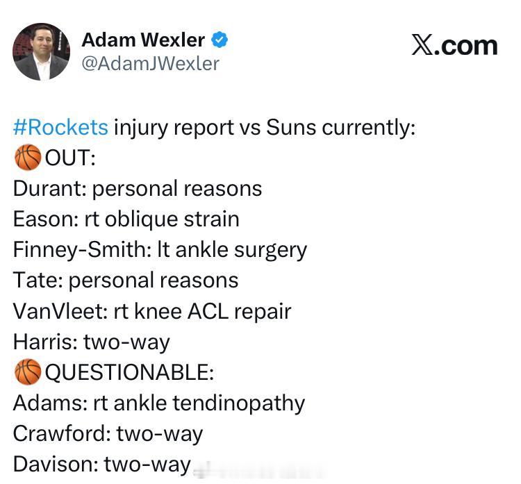 火箭明天vs太阳的伤病更新:杜兰特和泰特都是个人原因不能出战;芬尼-史密斯脚踝手术原因不能出战;伊森和范弗利特也是因伤不能出战;哈里斯在毒蛇没有召回也不能出战;亚当斯脚踝伤势出战存疑;戴维森和克劳福德在毒蛇不知道召回没有,出战存疑;这么长的伤病名单,明天能健康出战的就8人……