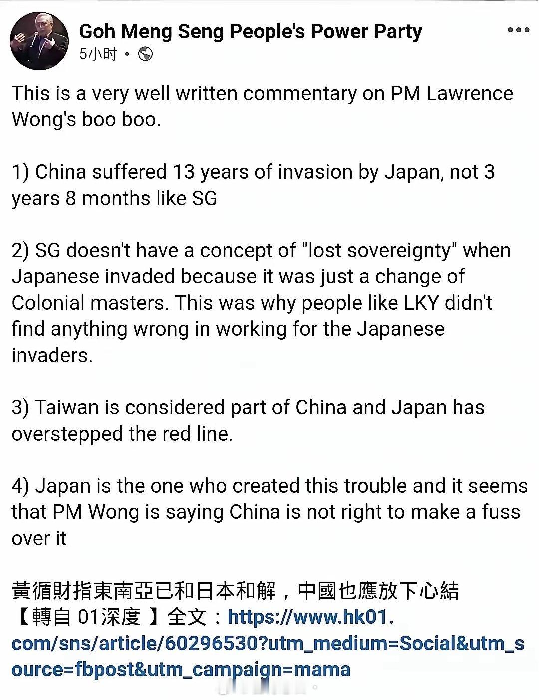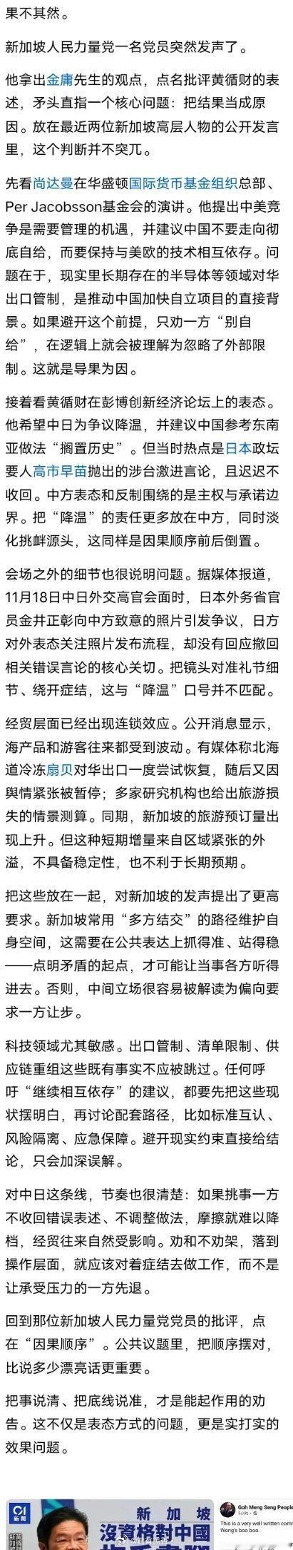 新加坡内部开始批评黄循财站队日本,帮高市早苗说话,认为黄循财搞错了因果关系,是高市早苗不当言论在先,中国反击在后,黄循财怎么反而说要中国放下历史,这是颠倒因果,不问青红皂白,拉偏架!不过我觉得新加坡是自导自演的,因为黄循财帮日本说话后,在我们这边引发广泛的批评,但是黄循财又拉不下脸来,收回那些表态,就找个新加坡内部的政客出来批自己的言论,就是做给我们看的,让我们知道它们新加坡内部不同意它之前的表态,试探一下我们气消了没有,如果气没有消,可能黄循财才会出来收回言论!