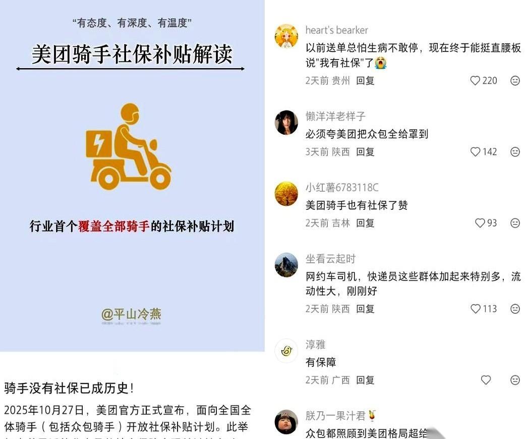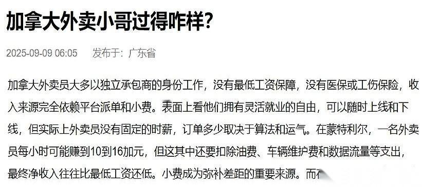 我勒个去,今天真被一个老外给上了一课。 一直以为国外的外卖小哥,怎么着也比咱这儿强吧?福利好,保障足,人还尊重他们。 结果,人家老外在西安点了趟外卖,直接震惊了,反过来说我们骑手的保障,把他们老家秒成了渣。 我还不信,专门去查了查。 好家伙,什么美国英国加拿大,骑手都是“个体户”。说白了就是,平台一分钱社保不给你交,出车祸了自己认栽,生病了就没钱赚。想有保障?行啊,自己拿钱买保险去。 这不就是纯纯的“临时工”么?风险全自己扛。 再回头看我们自己。 我承认,我也跟着骂了好几年某些平台,觉得他们不是东西。但今天才知道,人家已经悄悄给骑手搞了养老金补贴,交一半。连骑手家里人生大病、孩子上学,都有个兜底的钱。 更别说最基本的工伤险、意外险了。 这事儿魔幻就魔幻在,你猜怎么着? 外卖骑手,这群我们天天见,觉得最辛苦、最没保障的人,竟然成了国内蓝领里,最早摸到正经社保体系的那一拨人。 你再想想网约车司机、家政阿姨、货车大哥……他们呢? 当然,不是说现在就完美了。 但一个天天被骂的公司,不管为啥吧,居然先把这块硬骨头啃下来了,还逼得全行业都得跟上。 这感觉……怎么说呢,挺复杂的。 说白了,跑在路上的每一个人,不管中国外国,图的不过就是自己万一倒下了,别把整个家也砸趴下。 能有个兜底的,比啥都强。