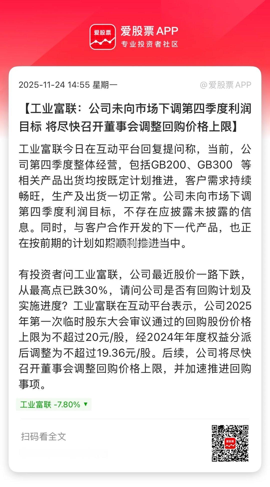 盘后工业富联辟谣了,一是没有下调四季度利润目标,二是回购算数,尽快召开董事会调整回购价格上限。现在小作文啥都能编,富联辟谣也算比较及时。但说真的,市场上有多少人真的知道原本的利润目标?回购大家更是忘了,要知道当时回购价格是不超过20块钱!本质上,还是大家对AI算力信仰松动了,机构在偷偷跑路。在A股有一个专门的战法:谣言出货法。就是一家公司连续暴涨后,有一天突然暴跌,马上出来一个谣言。这个谣言非常的无脑,非常容易被证伪,公司也往往会出来回应。散户一看这不是错杀么?就冲进去,然后庄家把货都给了你...!我觉得工业富联短期的业绩没问题,但A股资金总是喜欢抢跑,抄底还是需要谨慎一些。