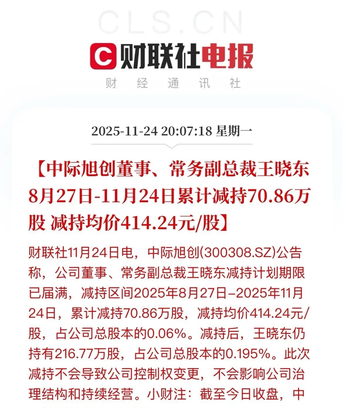 继续减持,高位一路减持下来,累计套现2.9亿元,实现财富自由了,人家这也算是越涨越高,越高越卖,从8月27日的324块钱,一路减到现在456块钱不知道这个给出的理由是什么,应该也是资金需求吧,2.9个亿,总共持有286万股,卖了70万股,还有216万股,CPO这波调整以来,累计跌幅10.71%,其中中际跌幅10.96%,新易盛高位下来跌幅28%,天孚高位下来累计跌幅27%,虽然调整很厉害,但今年以来CPO板块依然累计涨幅64%,中际今年以来累计涨幅272%,依然很牛啊。