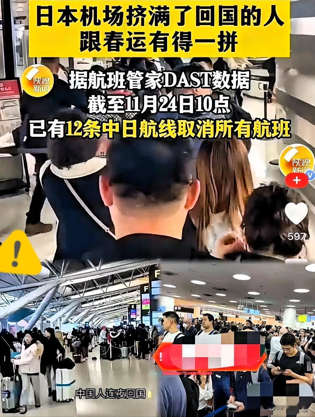 这下好了! 中日航线大面积停飞 当初非要去日本的那些人 现在在关西机场可算“热闹”透了。整个候机大厅人满为患,到处都是排队改签的、蹲在地上刷机票的,还有买不到票只能滞留的,这群当初喊着“有远见”的旅行者,如今脸上只剩焦急。 不光关西机场,成田机场也一样,值机柜台前的长龙全是要回国的中国人,跟往年春运挤火车似的,哪还有半点旅行的轻松。 有人吐槽,本来计划玩到月底,结果看到提醒就慌了,想改最早的航班,却被告知前面排了上百人,客服电话打一天都是忙音。 航班取消才是真头疼,航班管家数据显示,到24号上午10点,12条中日航线直接全停,关西机场最惨,天津、南京飞这的取消率快六成。 上海的李先生更倒霉,订的12月底飞关西的机票突然被取消,再查票价,直接涨了三倍还多,直呼“早知道当初就不该来”。 好在航司还算给力,月初国航、南航、东航就带头出了免费退改政策,后面十多家航司跟着响应,连国泰、春秋日本都加入了。 可日本旅游业彻底凉了,东日本旅行社说,17号退单才一成,18号就飙到七成,札幌那家溪流酒店,11月光中国游客订单就取消了70笔。 央视都报道了,现在已有54万张飞往日本的机票被取消,预计12月27号航班取消率能到21.6%,创一个月新高。 机场里滞留的人,拎着行李在大厅里打转,当初的“远见卓识”早不见踪影,只剩一个念头,赶紧买到票回国。