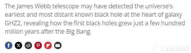 韦布望远镜:发现宇宙最早超大质量黑洞!据LiveScience最新报道,詹姆斯·韦布太空望远镜(JWST)可能已经探测到了宇宙中最古老、最遥远的已知黑洞,这个位于星系GHZ2中心的巨大天体,揭示了第一批黑洞在宇宙大爆炸后仅数亿年就开始形成的过程。这一发现有望帮助天文学家解开早期宇宙中黑洞形成与成长的奥秘。一个国际天文学家团队通过韦布望远镜的近红外光谱仪和中红外仪器的观测数据,发现了这个可能是迄今为止观测到的最遥远的超大质量黑洞。这些仪器覆盖了广泛的波长范围,能够探测到由该遥远星系发出的、因宇宙膨胀而被拉伸到红外波段的紫外线和光学光。这个巨大的黑洞位于星系GHZ2中,距离我们如此遥远,以至于天文学家观测到的是它在大爆炸后仅3.5亿年时的模样。星系GHZ2最初是由JWST在2022年发现的,它的光线需要经过约134亿年的漫长旅程才能到达地球。该研究结果已上传至预印本平台arXiv,如果这一发现得到确认,将为我们理解早期宇宙中黑洞的形成机制提供重要线索,特别是揭示第一批超大质量黑洞是如何在宇宙诞生后极短时间内迅速成长到如此巨大的规模。