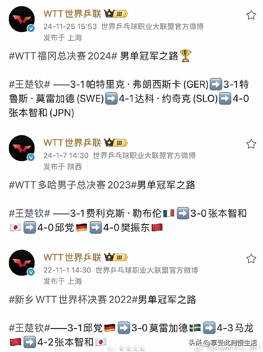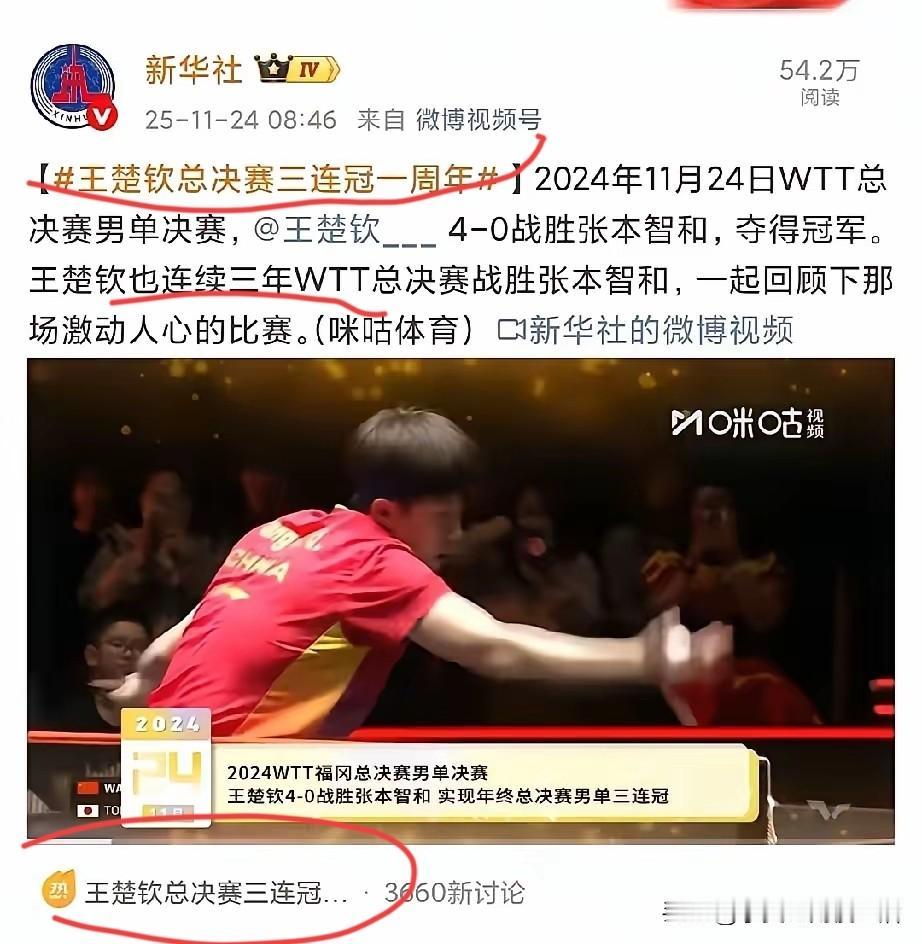 新华社又夸王楚钦了。我觉得新华社这么做有点不地道。今年的总决赛还没打呢,去年的都已经过去了。现在提前又倒腾出来是为了引流还是为了什么? 再说带的话题都不对。说三连冠一周年,24年两场不是三场。连续三年总决赛战胜张本智和。可是去WTT世界乒联官网上搜,有22年的,有24年的,中间的23年断了,怎么就能写连续三年呢。明显是不尊重事实的浮夸吗? 写总决赛三连冠一周年不对,写连续三年也不对。短短的几十个字竟然两处错误,作为最高级别的主流媒体也是醉了!