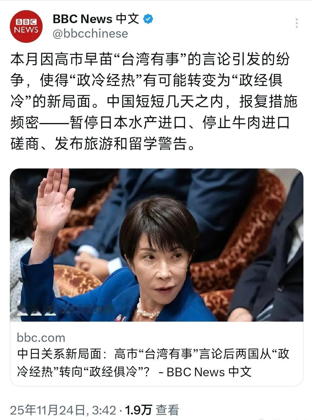 拒不让步还搞导弹部署,日本持续挑衅,中日缓和短期几无可能。 近期,日本首相高市早苗的那种“台湾有事就是日本有事”的错误言论,而且死不悔改,拒接承认错误,反而说这是日本一向立场,没有错。这如同泥石流一样冲击本来就不牢固的中日关系。面对日本如此嚣张跋扈,中国迅速祭出系列反制措施,暂停日本水产品进口、中止牛肉对华出口磋商、发布旅游与留学安全警告,短短数日便打破了多年来“政冷经热”的脆弱平衡,让双边关系濒临“政经俱冷”的危险边缘。而日本非但没有收敛,反而接连抛出对抗性动作,种种迹象表明,中日关系短期内的缓和之路已被日方亲手堵死,未来博弈仍将持续升级。 日本的强硬姿态,首先体现在对涉台错误言论的死不认错。高市早苗的言论本质上是对中国核心利益的公然挑衅。但面对中方的严正交涉和强力反制,日本政府毫无悔意,既未撤回错误言论,也未作出任何形式的道歉或澄清。 日本外务省高级官员甚至直言“按照中国的要求撤回首相的发言是不可能的”,这种强硬表态彻底关闭了通过外交沟通化解危机的第一道大门,也让中方看到了日方在涉台问题上的顽固立场。尤其高市早苗谬论得到82%支持,更让大家看到日本军国主义的流毒依然在泛滥。 而军事部署的针对性升级,进一步暴露了日本的对抗意图。11月23日,日本防务大臣小泉进次郎正式宣布,将在与那国岛部署中程地对空导弹,声称旨在“增强威慑并降低武装攻击风险”。但日媒毫不避讳地指出,此举核心目标是“应对中国军事压力和台湾潜在冲突”。这本质上就是构建干预台海的阵地,非常恶毒。 事实上,与那国岛紧邻中国台湾岛,是日本西南诸岛、也就是琉球群岛“多层阻击链”的关键节点,此次部署与日本此前计划在宫古岛、石垣岛部署反舰导弹的动作一脉相承,本质上是在构建围堵中国的前沿军事屏障。更值得警惕的是,日本还在推进“战斧”巡航导弹采购、组建太空作战部队等动作,其强军备战、染指台海的野心已昭然若揭。 在法理层面,日本对《联合国宪章》“敌国条款”的反驳,典型此地无银三百两。面对中方援引“敌国条款”对其军国主义倾向的警示,日方竟斥之为“荒谬”。联合国保留敌国条款,就是二战后为制约德日等法西斯战败国、防止侵略战争重演而设立的重要法律保障,赋予了反法西斯同盟国制约日本右翼势力的法理依据;从历史看,这几个国家的民族性格极端和偏执,你看日德意当前这些在台上政客首脑各个都是极端对华态度知道,所以先辈们考虑是有道理的。 日本急于摆脱“敌国”标签,本质上是想挣脱二战后国际秩序的约束,为其军事扩张铺路。当然,我们当前在走程序,日本人其实也是很慌的,因为我们天然被授予不需要联合国授权就可以打击日本权力,只要我们判定其军国主义已经开始处于死灰复燃的进程中就可以。 但是,国内舆论场中,部分“对日外交斗争够了”的声音更需高度警惕。必须清醒认识到,高市早苗的言论绝非偶然的口误,而是日本长期以来推进政治大国和军事大国战略、试图干预台海事务的国家意志的集中体现。推动修宪扩军、强化日美军事同盟,在西南诸岛密集部署军事力量等,日本的一系列动作早已形成系统性布局,其干预台海的意图绝非临时起意。 台湾问题是中国的核心利益,事关国家主权和领土完整,中方不可能在核心利益上妥协退让,对日反制也绝不会不了了之。以前日本偷偷摸摸干,我们要干预比较难,现在拉屎到中国头上了,自然不可能善罢甘休的。说对日反击已经够了的,不是愚蠢就是汉奸。 从“政冷经热”到开始走向“政经俱冷”,中日关系的恶化轨迹清晰可见,而这一切的始作俑者正是日本的持续挑衅。日方在涉台问题上的顽固立场彻底消磨了中日缓和的空间。当前,双方的博弈短期内难以收场,中日关系能否避免进一步滑向深渊,关键取决于日本是否愿意放弃对抗思维、回归和平发展轨道。但从目前的种种迹象来看,日本依然是一条路走到黑,中日关系的短期内缓和前景,大概率不行。