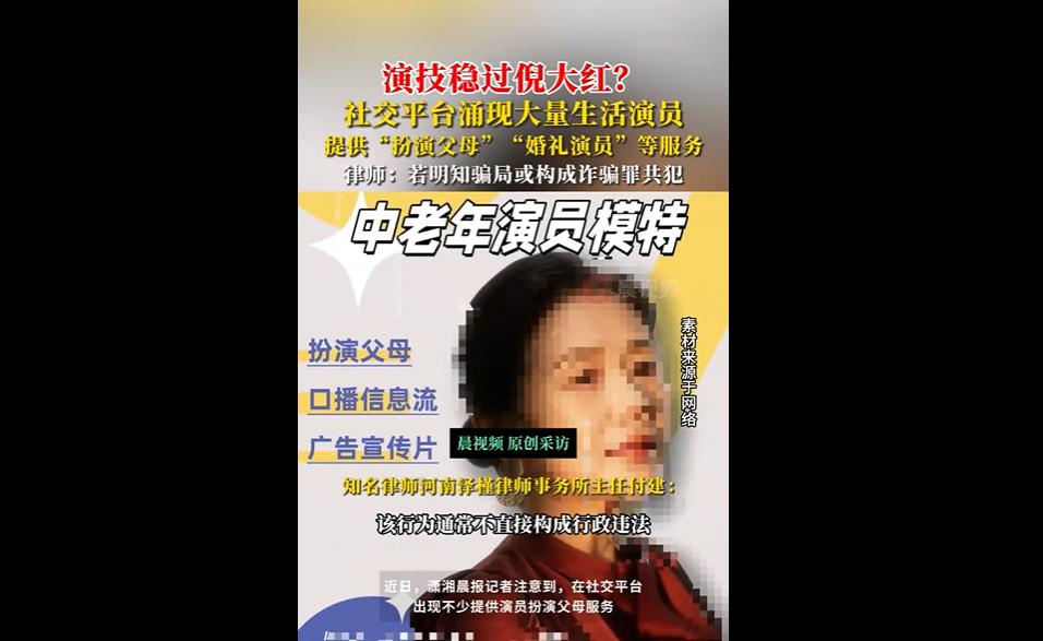 社交平台涌现大量 “演员扮演父母” 服务,经纪机构宣称可协助应对见对象、家庭聚会等场景,甚至号称 “演技稳过倪大红”。 律师表示,单纯扮演父母不直接违法但违背公序良俗,可能承担民事责任,若借此实施诈骗或协助诈骗,则构成犯罪。 这波 “租父母演戏” 简直是现实版 “剧本杀” 照进生活! 经纪公司把扮演父母包装成 “社交救星”,还吹 “稳过倪大红”,合着感情和家庭都能花钱外包,这操作又荒诞又离谱。 表面看是帮人应急撑场面,实则藏着不少坑。 轻则违背公序良俗,婚后被发现还可能成离婚过错方;重则被诈骗分子利用,假扮父母骗彩礼,直接触犯法律,演员和中介都得追责。 感情里最忌虚假,靠演员演出来的 “完美家庭” 终究是泡沫,戳破了只会更难堪。 与其花钱雇人演戏,不如真诚面对,毕竟真心换真心才走得远。也盼着相关服务能被规范,别让 “租父母” 变成骗人和被骗的温床!