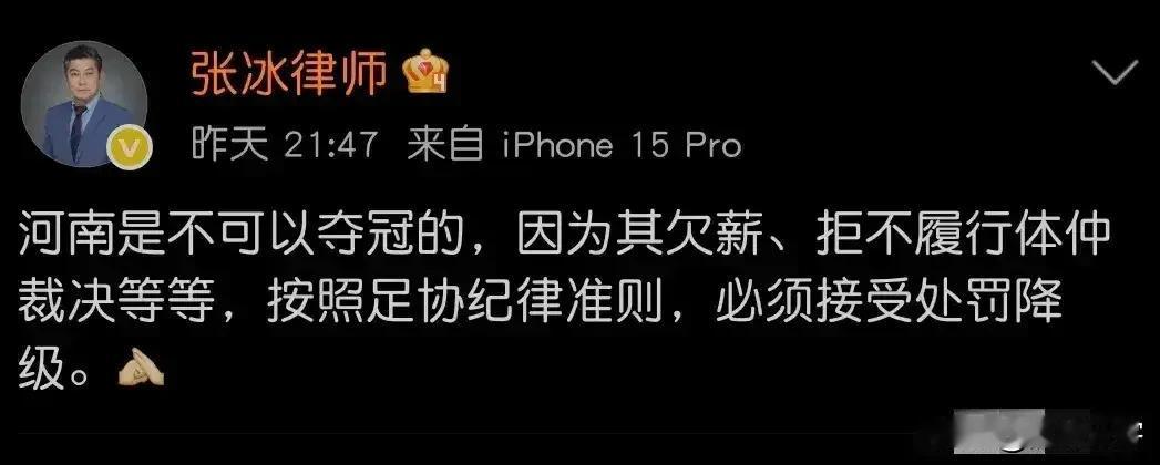 这个张冰就是一个典型的“搅屎棍”,按理说你的职业是律师,那就好好把自己的工作搞好得了,整天泡在足球领域里大放厥词刷存在感! 之前张冰曾经爆料蓉城欠薪,后来又将矛头指向国安,如今河南队联赛收官,体育总监和主教练也顺利续约,这货又像跳梁小丑一般跳出来说河南队欠账77万,如果是真的你可以带着当事人去打官司啊,何必在社媒平台上喋喋不休? 在此希望有关部门迅速出手,对于这种毫无职业道德,且居心不良的律师张冰予以永久封杀之![发怒][发怒][发怒]