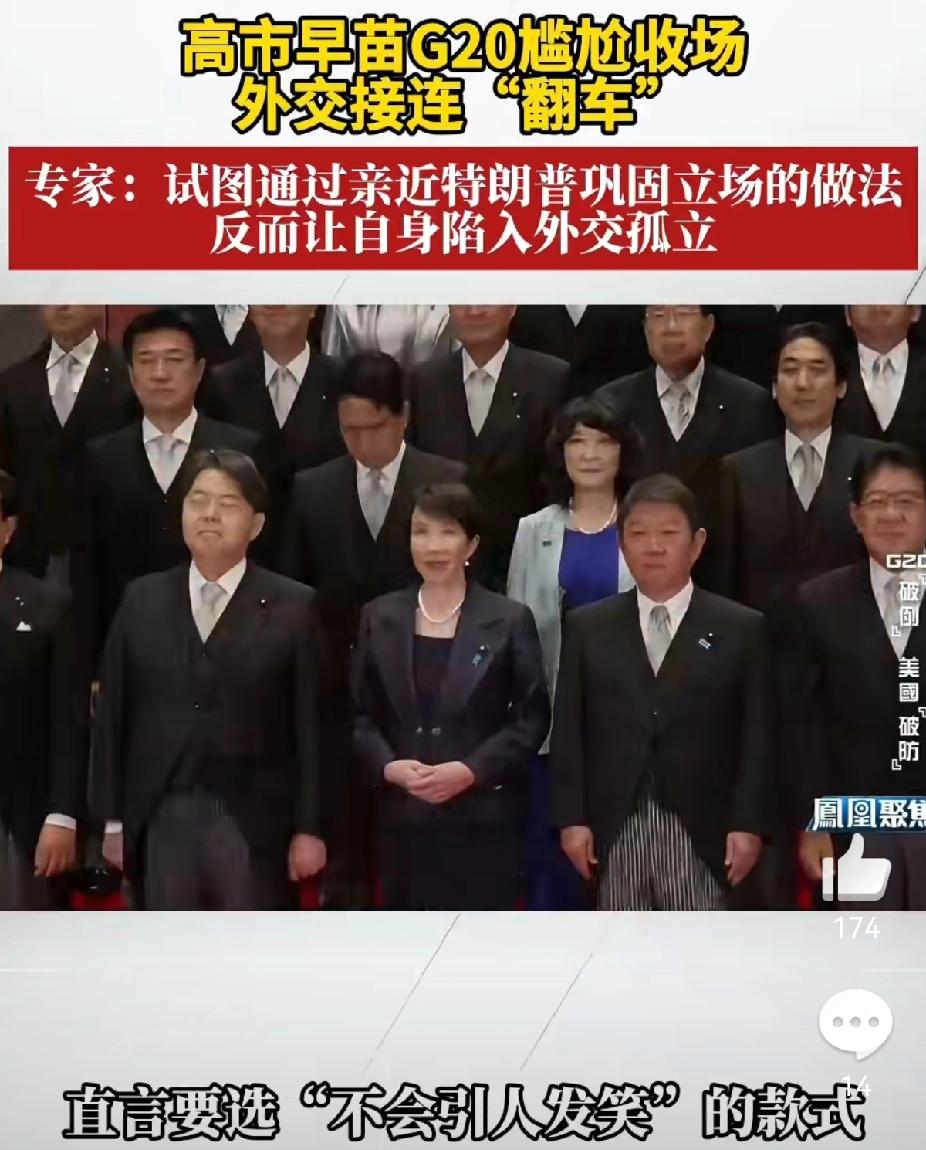 高市早苗G20把外交玩成真人秀,日本网友都喊她下台[吃瓜群众] G20峰会本是大国博弈的舞台,结果被日本首相高市早苗演成了“抓马现场”,堪称年度外交灾难名场面! 这位上任才一个月的“搞事早苗”,真是把“小家子气”刻进DNA了。为了选“不被人瞧不起”的衣服迟到一小时,结果精心打扮半天,还不如等她的那把椅子火,“高市专属迟到椅”表情包直接刷爆全网 。峰会上凑上去跟西方政客套近乎,抱完梅洛尼遭冷脸,合影时被东道主直接无视,尬笑全程像极了强行蹭流量的网红。 更离谱的是她的操作:一边承诺恪守中日声明,一边给“台独”分子授勋,还喊着“台湾有事就是日本有事”的疯话。这下不仅中方怒了,日本网友都炸锅,直言“你是国难”,各地抗议集会不断,满屏都是“高市下台”的呼声 。毕竟谁愿意跟着一个把心思放衣服上、却让国家经济受影响、还想挑事的首相呢? 老祖宗说“相由心生”果然没骗你,心里装着算计和挑衅,再怎么打扮也藏不住阴恻恻的劲儿。大家觉得这波操作是真糊涂还是装疯卖傻?你见过最离谱的外交名场面是什么?评论区聊聊~ 高市早苗外交灾难 G20峰会名场面 相由心生