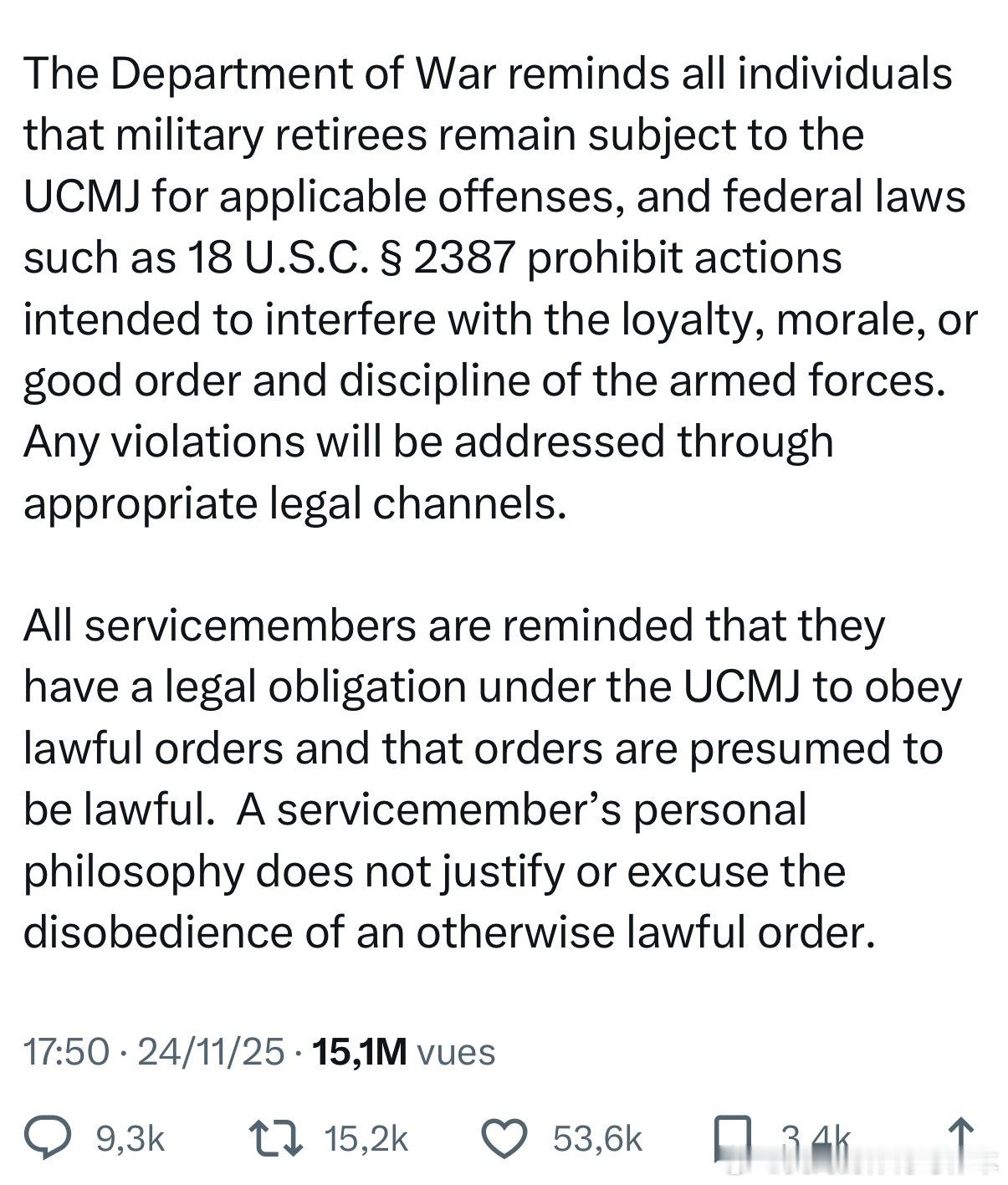 【黄金时代】战争部启动对煽动叛乱的退役海军上校马克凯利的审查官方声明:美国战争部收到针对美国海军上校(退役)马克·凯利的严重不当行为指控。根据《统一军事司法法典》(10 U.S.C. § 688)及其他适用法规,已启动对这些指控的全面审查,以确定后续行动,包括召回现役接受军事法庭审判或采取行政措施。此事将严格按照军事法律处理,确保正当程序和公正性。为维护程序的公正性,官方将尽量减少进一步评论。战争部提醒所有人员,退役军人仍须遵守《统一军事司法法典》的相关规定,联邦法律(例如18 U.S.C. § 2387)禁止任何旨在干扰军队忠诚、士气或良好秩序和纪律的行为。任何违规行为都将通过适当的法律途径予以处理。所有军人都应谨记,根据《统一军事司法法典》(UCMJ),他们有法律义务服从合法命令,且命令均被推定为合法。军人的个人理念不能成为其违抗合法命令的理由或借口。