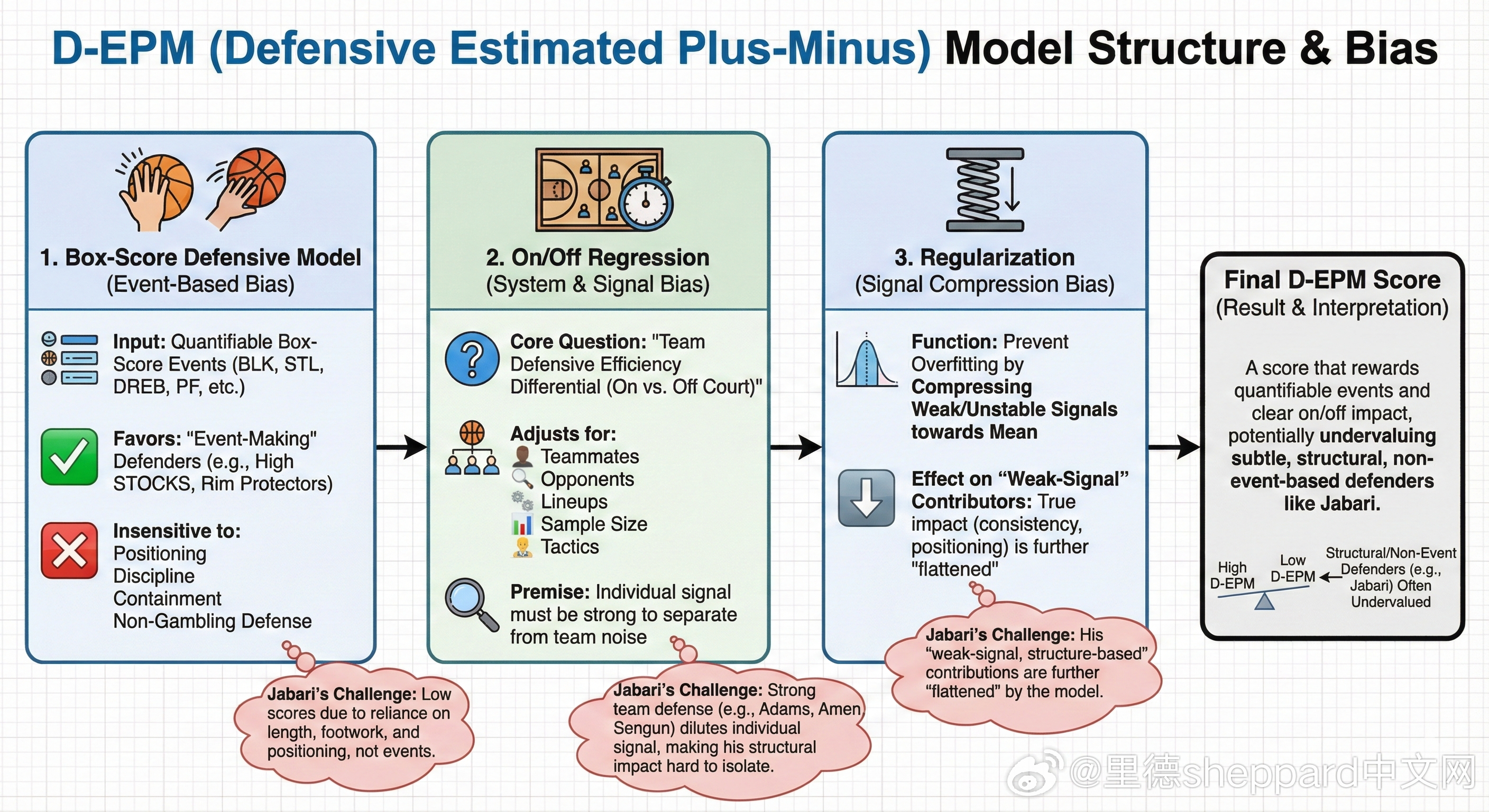 为什么 D-EPM 可能低估贾巴里·史密斯的防守影响?——从模型结构与可视化图表出发随着数据分析在 NBA 中的普及,Estimated Plus-Minus(EPM)已经成为衡量球员攻防影响力的重要综合指标。其中的防守部分——D-EPM——更是被视为公开领域最具参考价值的防守模型之一。然而,即便模型整体表现稳定,它依然存在结构性局限,这些局限会系统性低估某些类型的防守者。火箭前锋 贾巴里·史密斯(Jabari Smith Jr.) 很可能就是这样的典型案例。要回答“D-EPM 是否忽略了贾巴里的真实防守贡献”,需要从模型结构、数据输入方式,以及实际可视化图表三个维度综合分析。一、D-EPM 的模型结构:模型究竟在捕捉什么?D-EPM 由三个核心模块构成(图1为模型结构示意图),每个模块对不同类型的防守行为具有先天偏向。(1)Box-Score Defensive Model:偏好“事件型”防守贡献模型首先依赖传统可量化的箱线数据(box score),包括:-盖帽(BLK)-抢断(STL)-防守篮板(DREB)-犯规(PF)-其他数据可观测事件换句话说:D-EPM 的第一层结构优先奖励“制造事件”的防守者。例如:抢断型外线护框型内线STOCKS(STL+BLK)抢断+盖帽密度高的球员但对以下贡献则不敏感:位置感与纪律性延误进攻(containment)持续正确的防守站位迫使对手放弃攻击不冒险的限制型防守而这些恰恰是贾巴里的主要防守方式。贾巴里防守并不依靠抢断或盖帽吃饭,他更多依赖:高度脚步移动能力保持防守站位来完成防守。因此,在模型的第一个模块里,他天然难以获得高分。(2)On/Off Regression:强体系会掩盖个体贡献D-EPM 的核心在于评估:“球员在场 vs. 不在场,球队防守效率差异是多少?”并对以下因素进行调整:队友质量对手水平阵容搭配样本量战术环境理论上,这能更贴近真实影响;但前提是:个体信号(数据)必须足够强,才能从团队噪音中被“分离出来”。而贾巴里遇到的最大问题是:火箭整体防守体系太强,防守突出的球员很多,他的信号容易被队友同样优秀的表现“吞没”。火箭的防守包含多个“强刺激信号”球员:海王(Adams):篮板与护框谢泼德(Sheppard):高盖帽密度(相对身高)、抢断阿门(Amen):横移速度、持球压迫奥科吉 / 伊森(Okogie / Eason):外线对抗、强破坏型防守杜兰特(KD):对位防守数据极强申京(Sengun):低犯规限制型护框这些球员的数据信号清晰、贡献相对容易被模型识别。相比之下,贾巴里的防守方式更偏向:限制延误换防维持球队整体防守结构稳定这种“弱信号、防守结构型”价值更容易被 on/off 模块忽视,使模型难以判断:这到底是贾巴里本人的作用,还是火箭体系的自然产物?模型很难通过现有数据做出判断(3)Regularization(正则化):弱信号会被进一步压缩为了避免过拟合,EPM 会自动将弱且不稳定的信号向均值压缩。对贾巴里这样的球员而言——他的防守依赖连贯性,覆盖率和站位,而非抢断或盖帽——这意味着:他的真实防守贡献会被模型进一步“抹平”。二、模型的结构性盲区:刚好与贾巴里的防守方式重叠综合来看,D-EPM 的主要盲区包括:盲区 A:位置型防守(positional defense)难以量化模型容易识别以下贡献:抢断盖帽护框干扰但难以量化:持续正确的防守站位迫使对手放弃进攻选择但没有造成对方失误手部干扰但无 deflection(触球干扰)这些行为毫无疑问是场上真实价值,但模型对此几乎无感。盲区 B:换防(switching)与延误(containment)通常不被视为“事件”贾巴里的核心优势之一——多位置换防能力,包括:可覆盖 1–5 (你可以说他覆盖某些位置效果并不优秀,但确实具有换防能力)延误高位攻防让对手从高质量高价值出手转向低质量低价值出手但这些行为通常不会带来:抢断盖帽对手失误对手命中率显著下降对依赖事件数据与 on/off 波动的模型来说,这类价值无法显性呈现。三、结合图表:贾巴里的 D-EPM 落点正好印证模型偏差火箭 EPM 攻防散点图(图2来自),将这一点直观呈现。1. 全队 D-EPM 都集中在 -0.5 ~ +0.5 的狭窄区间这说明:火箭防守高度体系化,而非依赖单点防守或者围绕某个防守强点建立体系个体差异被模型平均化整队个体防守者都被识别为“中性防守者”这是典型的 强防守体系防守队的数据特征。2. 贾巴里在图中的位置:进攻略正,防守接近 0 或略负图中贾巴里的落点代表:模型将他视为“中性防守者”,而非强点。原因正是:事件少信号弱模型无法捕捉防守贡献因此被压缩到接近 0。3. 对比奥科吉、阿门,谢泼德等“事件型”防守者他们的 D-EPM 明显偏正,因为他们在:盖帽(相对位置与身高)抢断限制对位命中率在模型中都具有相对突出的统计信号。这进一步说明:D-EPM 善于识别“破坏型”防守者,但不擅长识别“限制型、防守结构型”防守者。四、综合模型结构 + 防守风格 + EPM图表落点:D-EPM 在结构上可能低估贾巴里·史密斯的防守影响力。原因包括:事件型数据贡献不足 → 模型不偏好他这种防守者火箭防守依靠体系和团队 → 个体信号被稀释换防、延误、站位 → 模型难以捕捉正则化进一步压缩弱信号比赛中的真实影响无法转化为模型重视的数值一句话总结:D-EPM 能很好捕捉谢泼德、阿门这类“破坏型”防守者,却对贾巴里这种“限制型、纪律型、多位置覆盖者”并不敏感。五、数据重要,但不是防守价值的全部贾巴里的防守影响体现在:多位置覆盖范围防守纪律保护整体防守结构与阵型这些让队友防守变得更轻松的“隐性价值”这些都