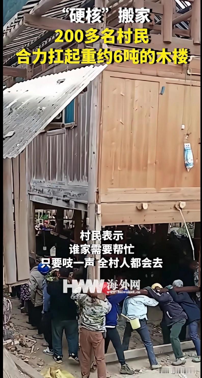 这才是“全村的力量”!200多个村民,居然把6吨重的木楼给抬起来搬家了! 你看这画面:木楼下乌泱泱全是人,肩膀抵着、手撑着,喊着号子一点点挪——这哪是搬房子,是把“邻里情”扛在肩上啊! 村民说“谁家有事吱一声,全村都来”,这话听得人鼻子一酸。现在城里住对门都不认识,可村里还是“一家有事全村帮”:你家盖房我递砖,他家搬家我抬梁,6吨的木楼,靠的就是这股“搭把手”的热乎劲。 评论区都在羡慕:“这才是小时候的村子啊!”“这种凝聚力,比啥都值钱!” 有时候最硬核的不是机器,是一群人拧成一股绳的真心。