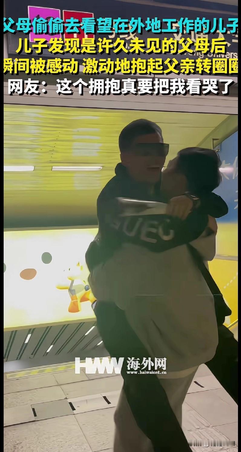 这一抱直接把我看哭了! 父母偷偷跑去外地看儿子,一见面,儿子愣了两秒,直接把老爹抱起来转圈——那股子激动劲儿,都快从屏幕里溢出来了! 评论区全是共鸣:“我爸妈上次偷偷来我城市,我开门看见他俩的瞬间,眼泪直接砸地上”“在外打拼最盼的就是这‘不打招呼’的温暖”。 其实爸妈的爱从来都藏在“偷偷”里:偷偷攒钱给你塞红包,偷偷记着你爱吃的菜,连来看你都怕打扰,只敢“突袭”。而孩子的回应更直接:一个拥抱,就是把所有想念都裹进去了。 离家再远,只要一回头,爸妈永远在身后。这大概就是“被人惦记着”的最甜模样吧。