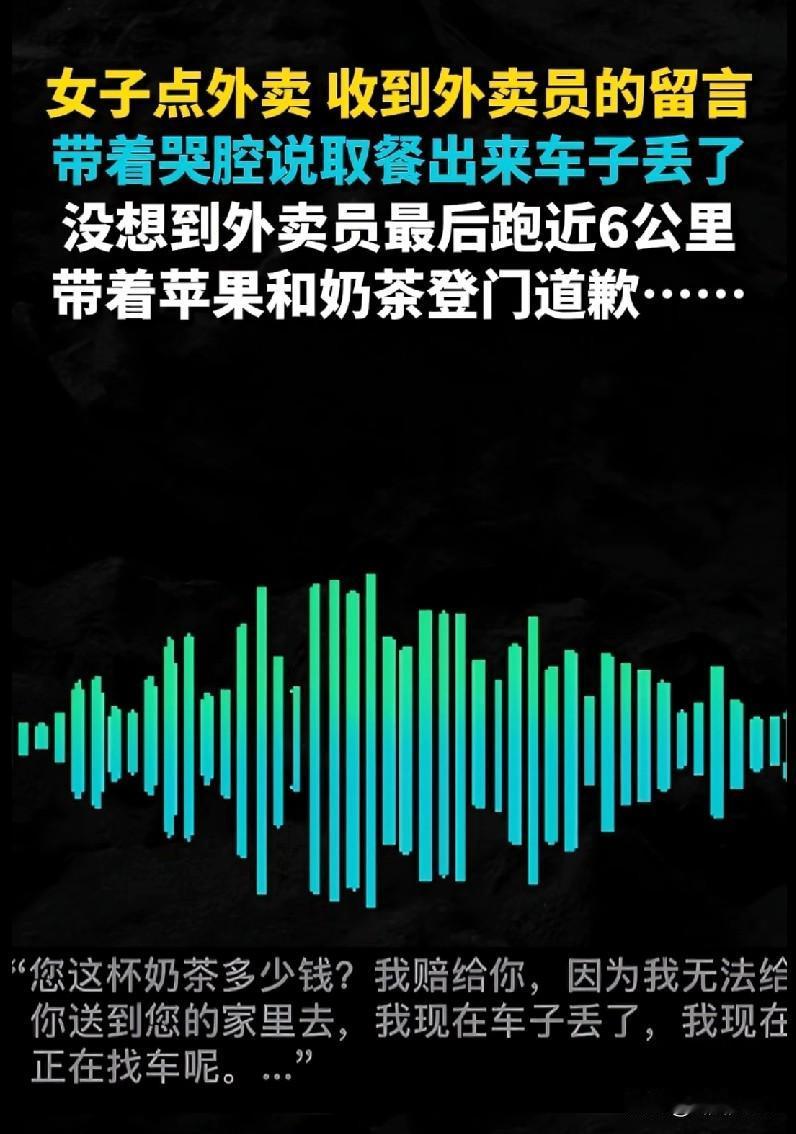 这外卖员也太戳心了! 姑娘点了杯奶茶,收到外卖员带着哭腔的留言:“我车子丢了,没法给你送,奶茶钱赔你…”本来以为这单黄了,结果没一会儿,外卖员跑了近6公里找上门——手里不光拎着奶茶,还多了苹果,红着眼说“对不起让你等久了”。 评论区直接破防:“他自己都急哭了,还记着给顾客赔礼”“这哪是送外卖,是揣着真心在做事啊”。 其实谁都不容易:外卖员丢了车,大概率一天白干;可他宁愿跑6公里,也不想让顾客失望。这世上的善意,从来不是“应该做”,而是“我愿意为你多走一步”。 一杯奶茶,跑出了比距离更暖的温度。