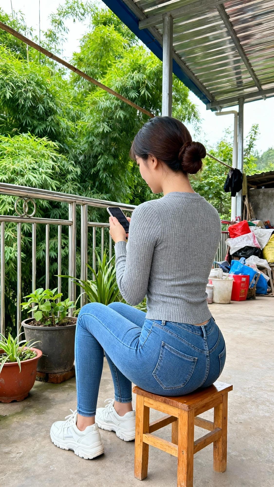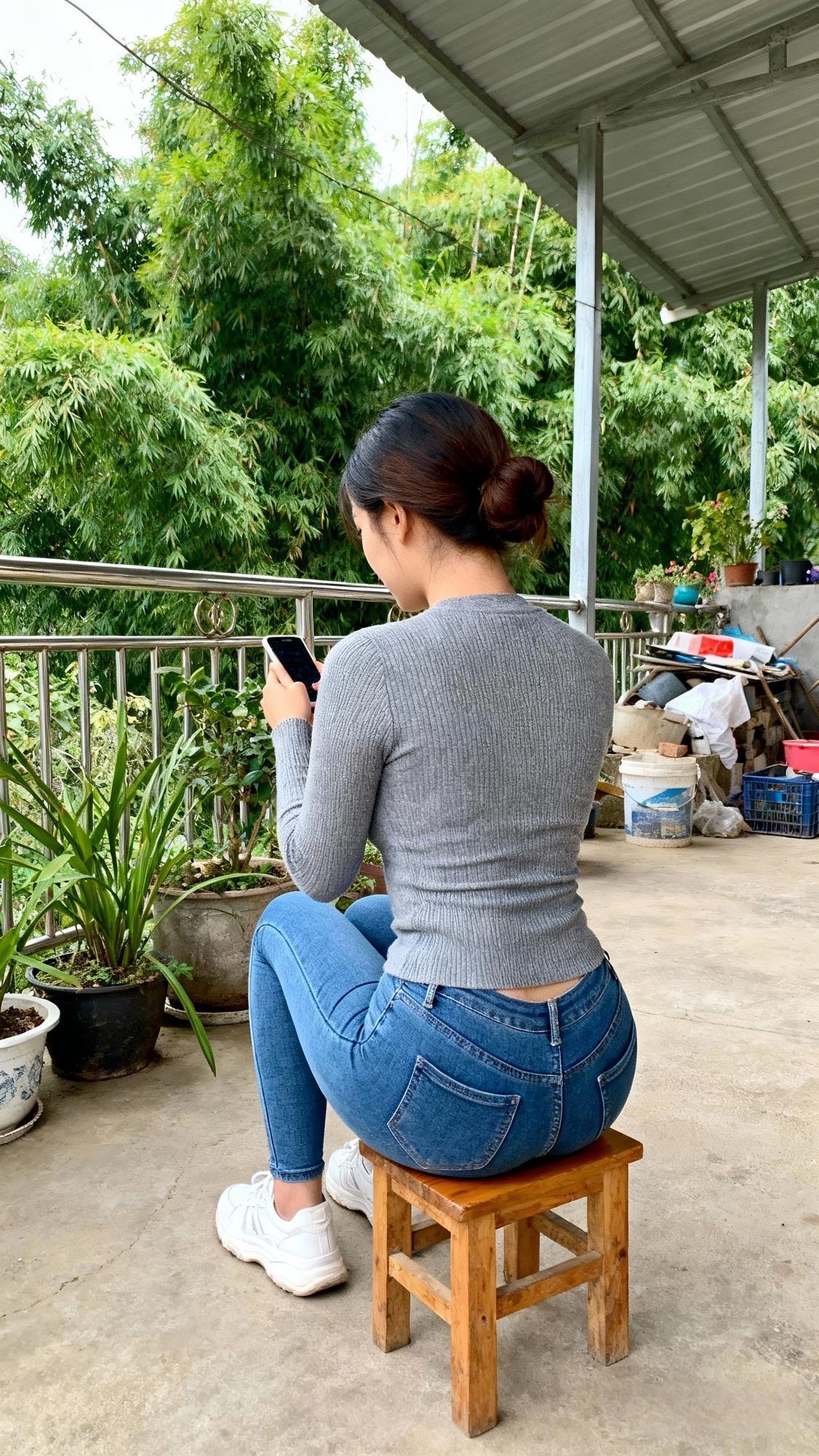 棚顶滤过的光,落在灰针织的纹路里,像揉碎的云。发鬓挽成的圆髻,垂着几缕软发,随风蹭过肩线。指尖蜷着冷屏,在绿植与杂物织就的烟火气里,圈出一方静。 矮凳承着牛仔蓝的舒展,白鞋沾了点露台的尘。屏幕明灭间,夏意漫过盆栽的叶,把这片刻,裹成了时光里轻晃的碎句。农村