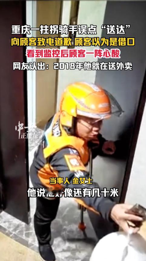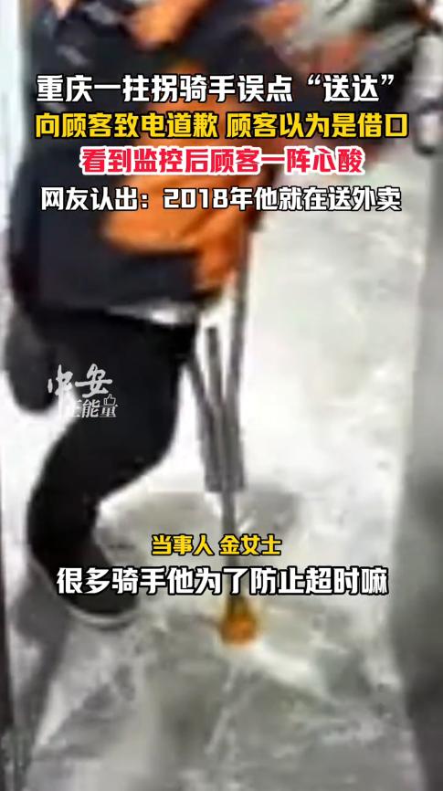 “看哭了!”11月23日,重庆,一女子中午点了份外卖,结果骑手还没送到,手机上就显示“已送达”,很快,骑手就打来电话,表示自己不小心点错了,很快就给送过来。女子本以为是对方找的借口,可见到骑手的那一刻,她却忍不住打赏。 外卖员每天都在大街小巷中奔波,人们已经见怪不怪了,而在这类人群中,也不乏一些身体残疾的人,他们身残志坚,依靠自己的双手努力活着! 这天,金女士在家休息,觉得中午下楼去吃饭有些麻烦,就拿起手机点了份外卖。 不一会儿,骑手就接单开始送货了,可是令金女士没想到的是,明明外卖还没到,手机上就显示送达了。她以为这是要超时了,骑手来不及送货使得小心思。 紧接着,骑手就打来电话,表示刚才操作时按错了,还有几十米的距离,让她不要着急。金女士则表示把外卖放门口就行,自己等会过去拿。 金女士又等了两三分钟,外卖就送到了,手机上的时间也没超时,这就让她很纳闷了,于是便看了一下监控,竟意外发现骑手是名残疾人! 金女士立即就感觉不好意思,人家这么努力的工作,自己却怀疑他,实在是抱歉,于是立即给骑手进行了打赏。 网友看后表示,残疾人就业不容易,外卖行业给了他们一个机会,他们也十分珍惜,做得丝毫不比正常人差! 信息来源:《11月23日,重庆。重庆一拄拐骑手误点“送达”,向顾客致电道歉,顾客以为是借口,看到监控后顾客一阵心酸。网友认出:2018年他就在送外卖。》中安在线