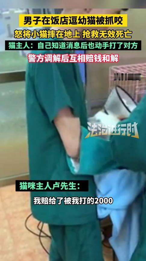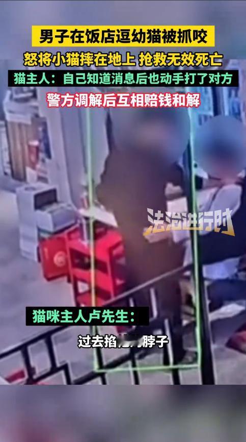 “严查到底!”11月24日,广东珠海,一男子去健身房锻炼,委托朋友帮忙把小猫送回家,不料,一名顾客逗猫时声称被抓伤,随后将3周大的小猫活活摔死,男子得知后,赶来将顾客打了一顿,事后赔偿对方2000元!网友:人怎么能这么坏! 现在很多人都喜欢养猫猫狗狗,有了这些毛孩子的陪伴,感觉生活也没有那么无聊了,不过,小猫小狗都很顽皮,主人一定要看管好,以免抓伤他人。 前不久,卢先生养了一只小奶猫,他在一家饭店上班,为了方便照顾小猫,他就一并带去了。 事发当天,卢先生下班去健身房,由于朋友在店里吃饭,他就拜托朋友等会把猫带回家。没过一会,朋友的朋友坐了过来,开始逗小猫玩耍。 结果,那人说小猫抓破了他的手,然后生气的将小猫砸向地面,小猫当场口吐鲜血,抽搐起来。 朋友见状立即起身找对方理论,同时联系了卢先生,听此噩耗,卢先生马不停蹄的赶往饭店,由于情绪过于激动,将男子打了一顿。 报警后,民警建议协商处理,但是卢先生不愿意,最终卢先生赔偿给男子2000元,男子则赔偿卢先生5000元,而小猫还是没能救回来。 网友看后表示,这种人真是太缺德了,小奶猫没有啥攻击力,就算被抓了也抓不破,即使抓破了,去医院打疫苗就可以吗,为什么要把猫给摔死呢? 信息来源:《广东一男子饭店内摔死幼猫,男子称被幼猫抓咬,猫主人:小猫不到三周大,无攻击力,该男子拒绝承担医药费》潮新闻