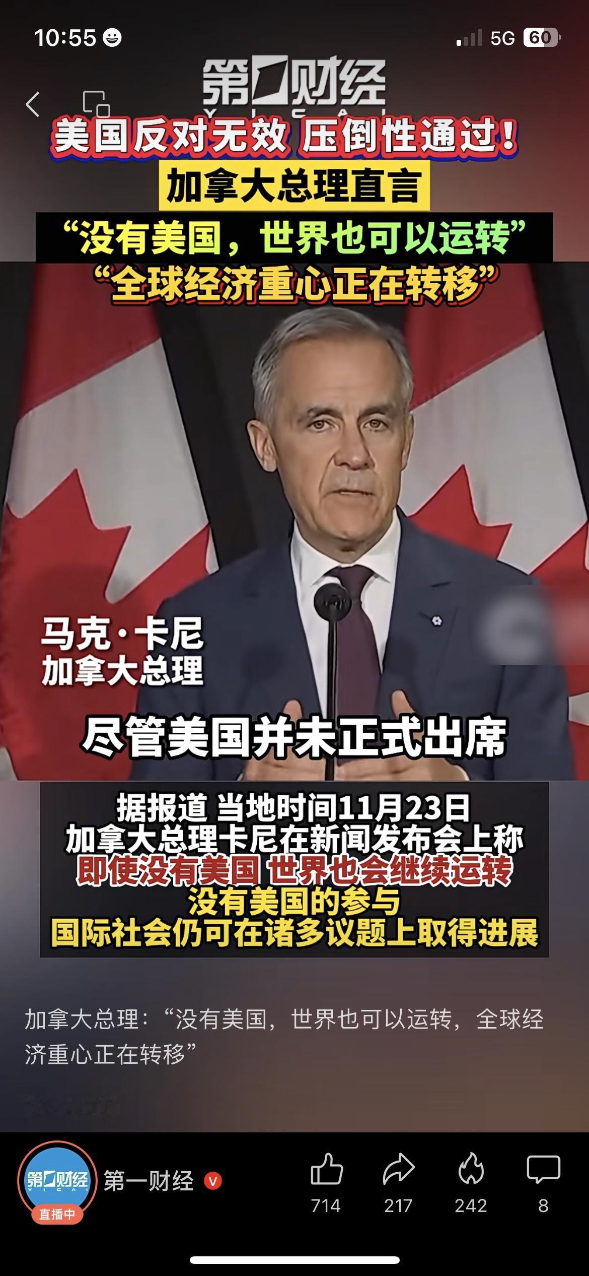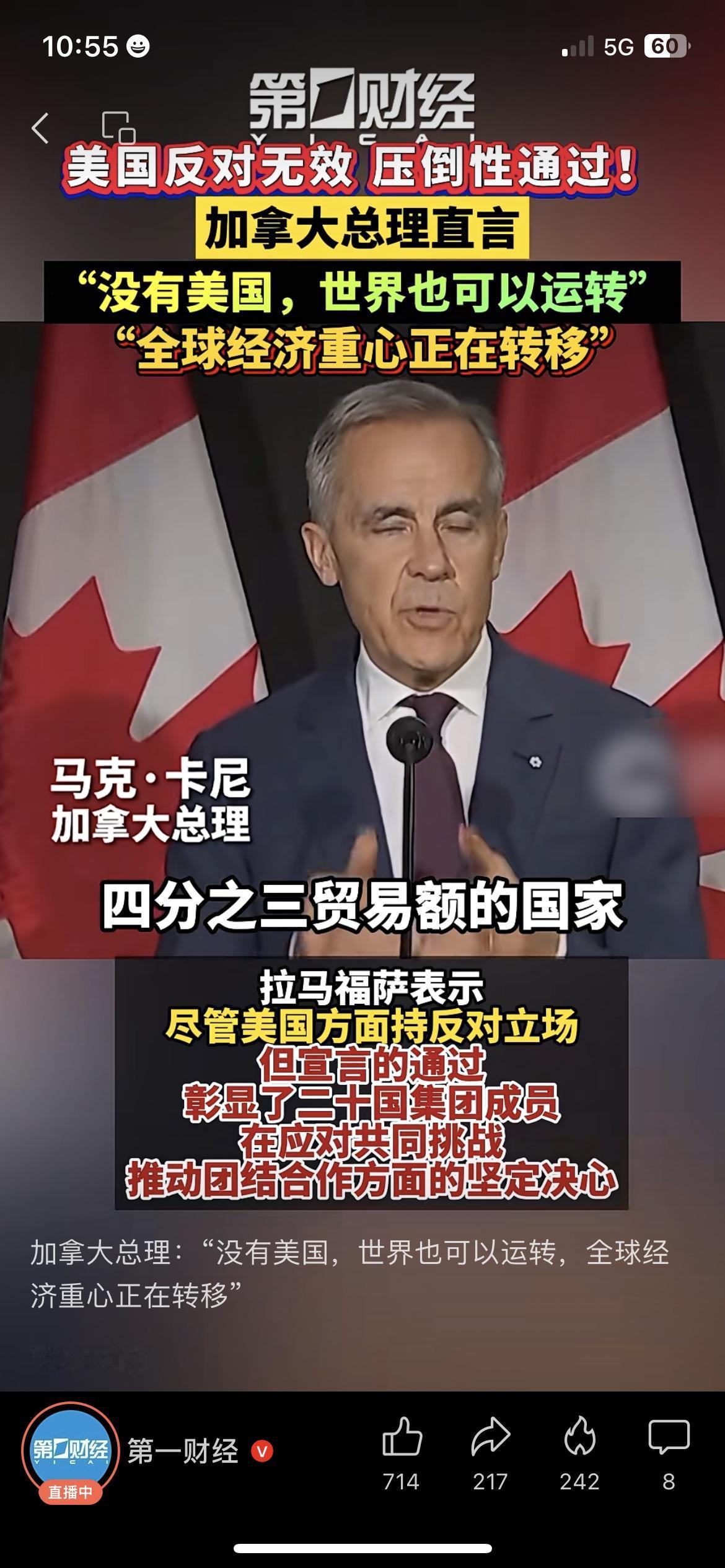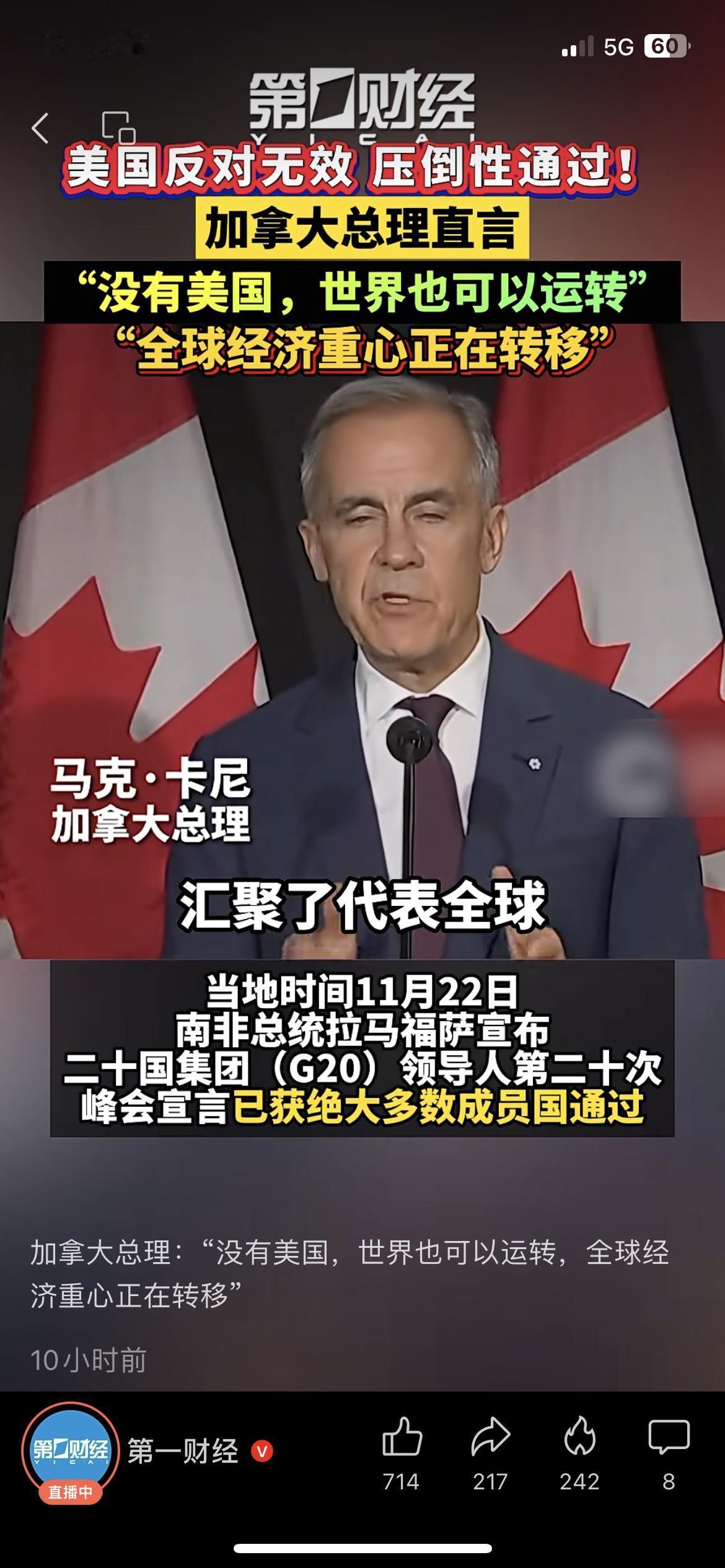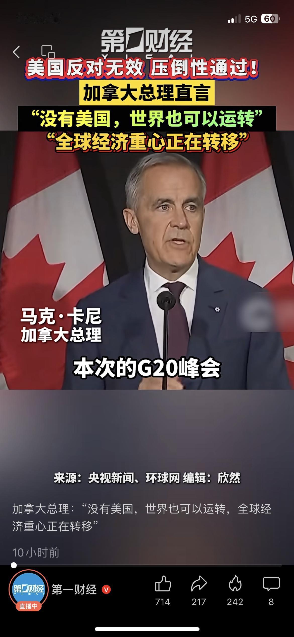 刚刷到个挺炸的消息——加拿大总理卡尼这两天在发布会直接“开麦”:“就算没美国,世界照样转”,还明说“全球经济重心正在挪地方”。 这次G20峰会美国都没正式来,结果相关议题还是“压倒性通过”了。现在这风向,是不是越来越有意思了?你们品品这信号够直接不~