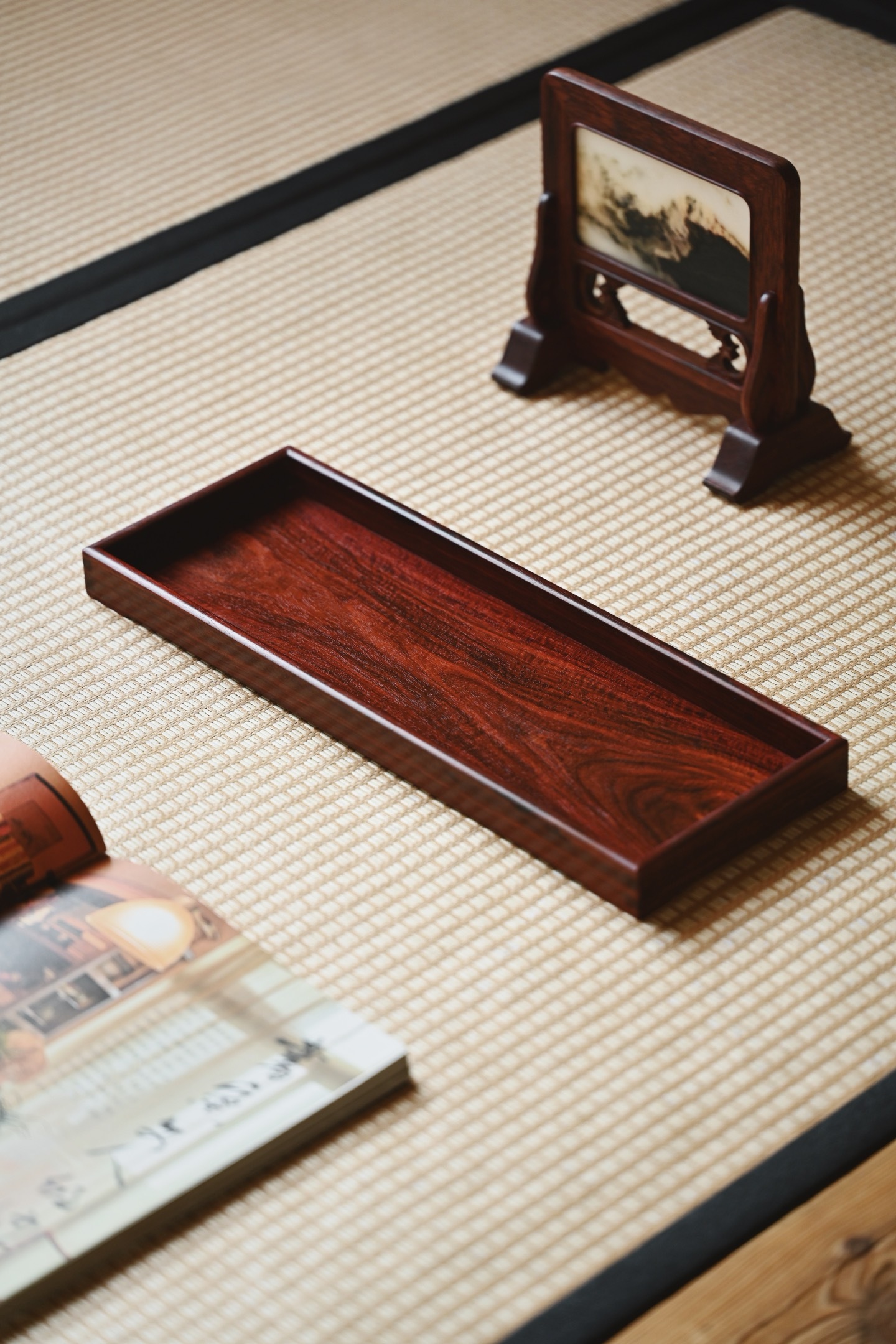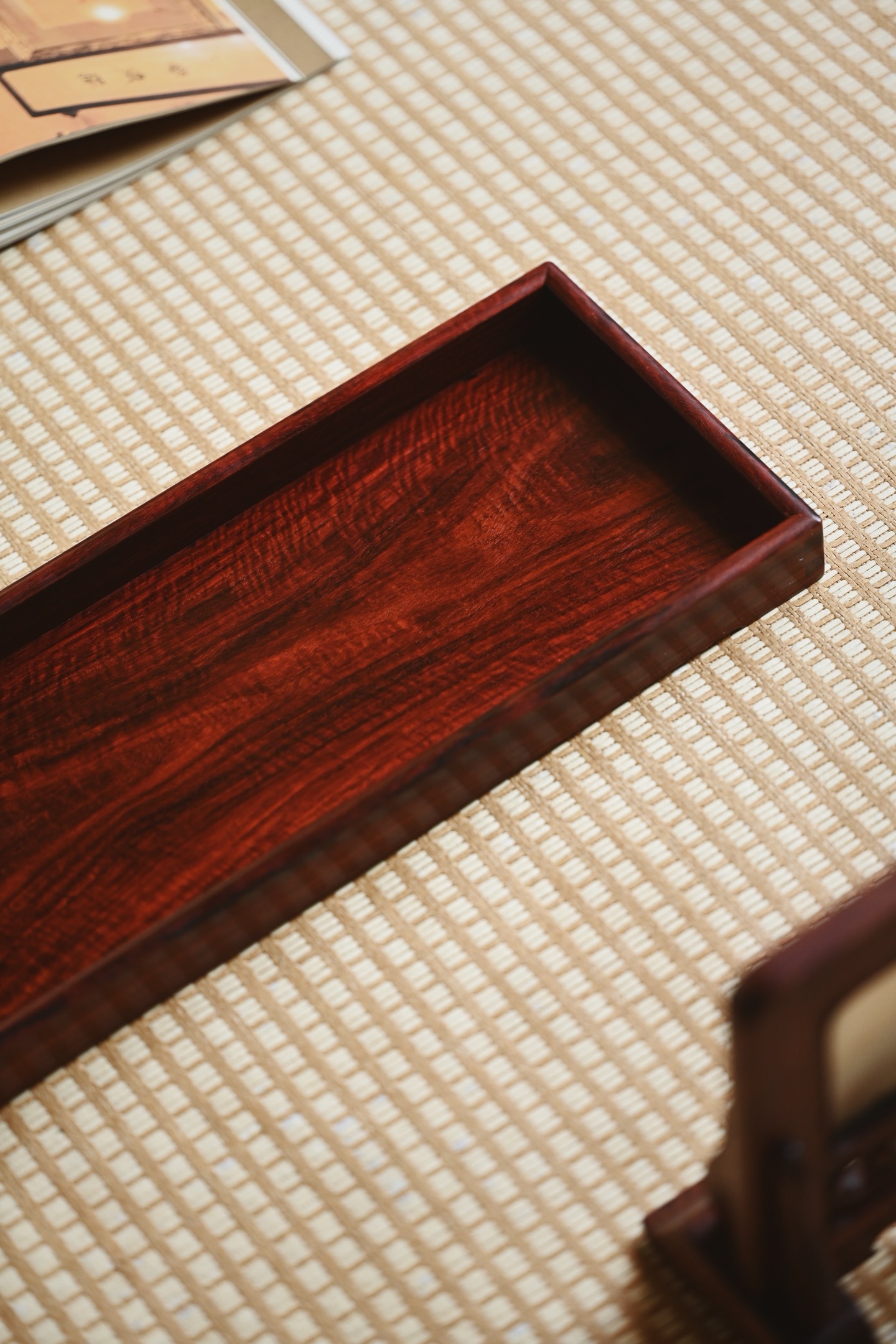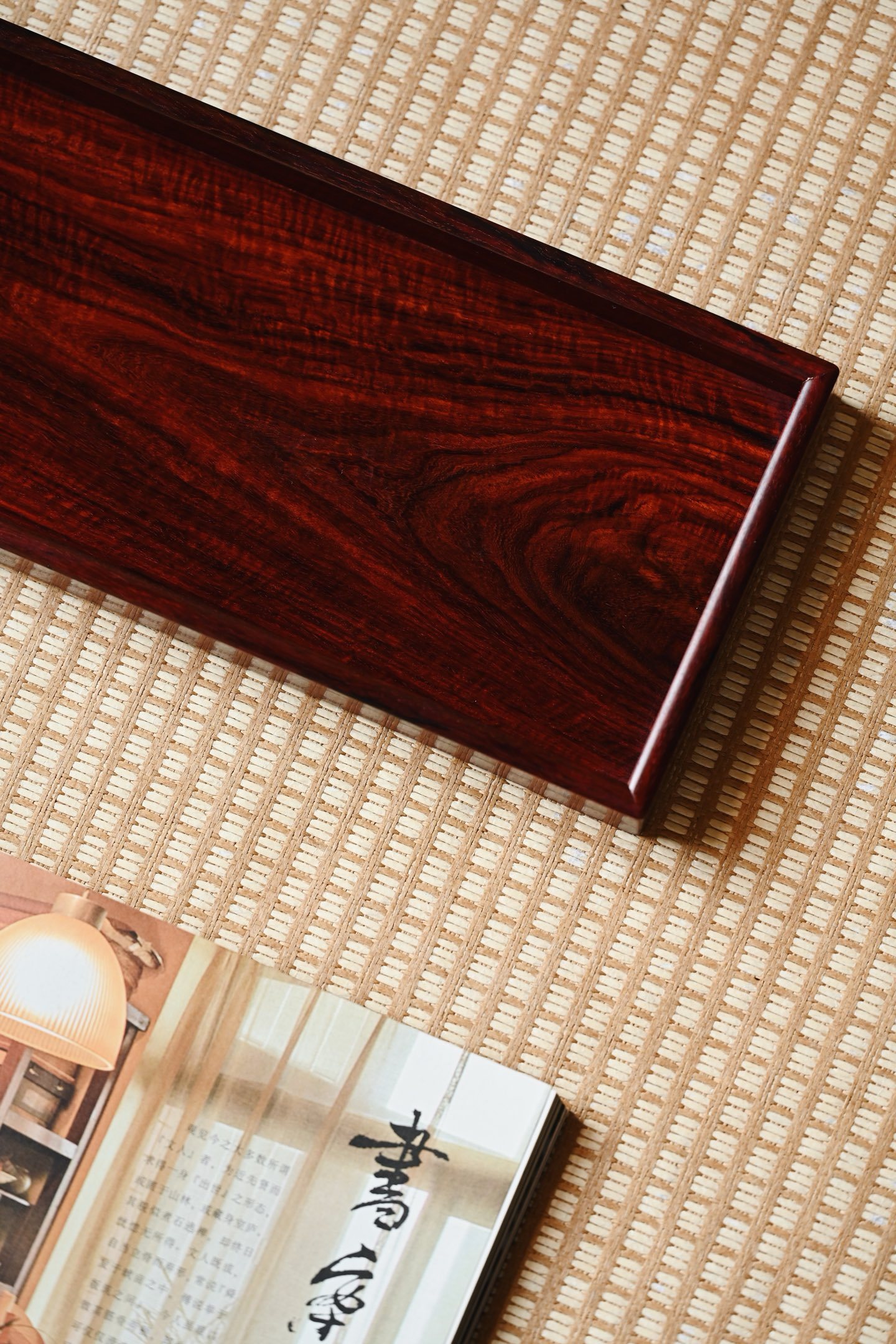紫檀独板 | 清意 水波纹文盘独板制,色泽温润,水波纹理分明,层次起伏变化,似水波涟漪,颇合画意,可作为文房承盘,亦可用于茶室。39*14*2.8cm 445g