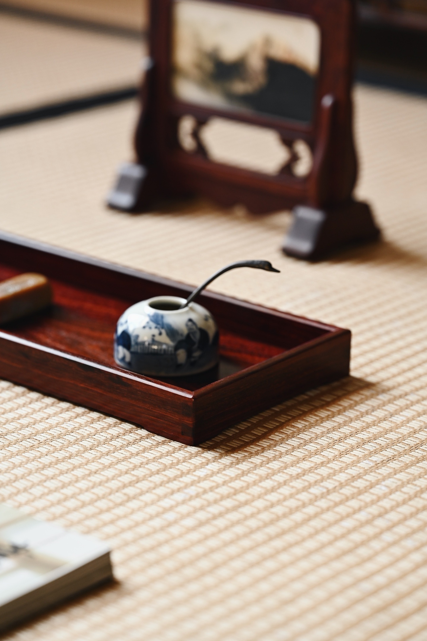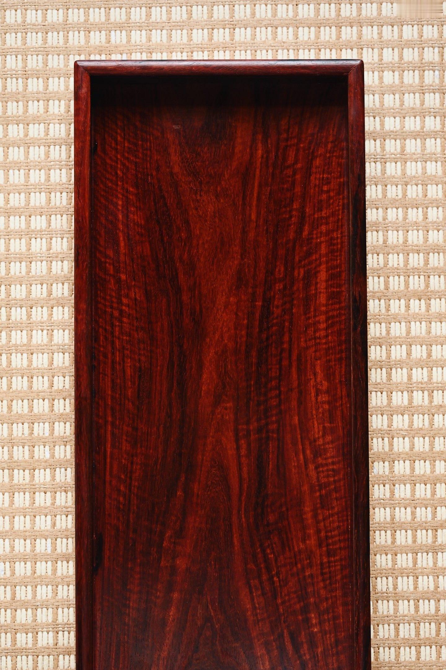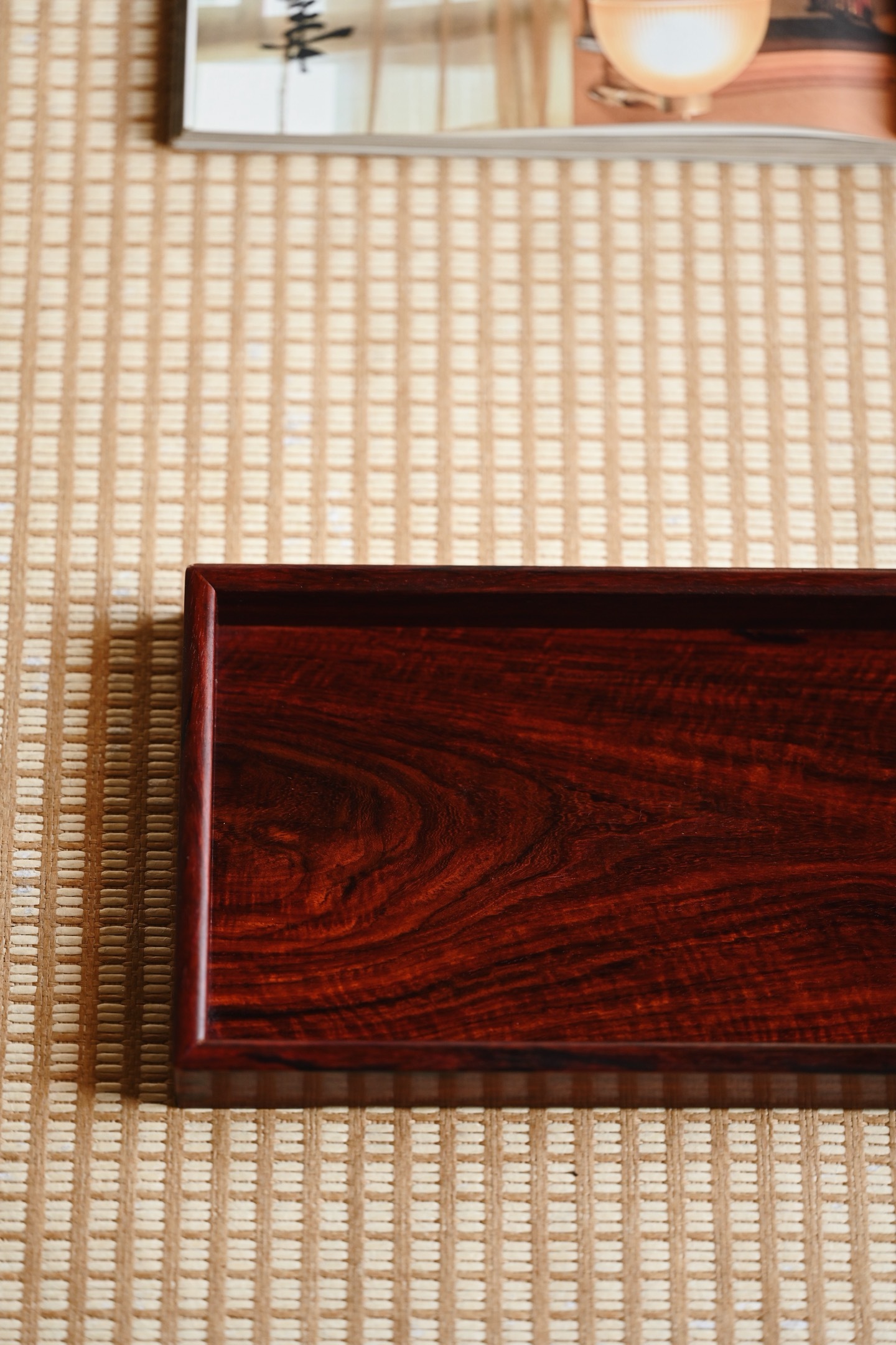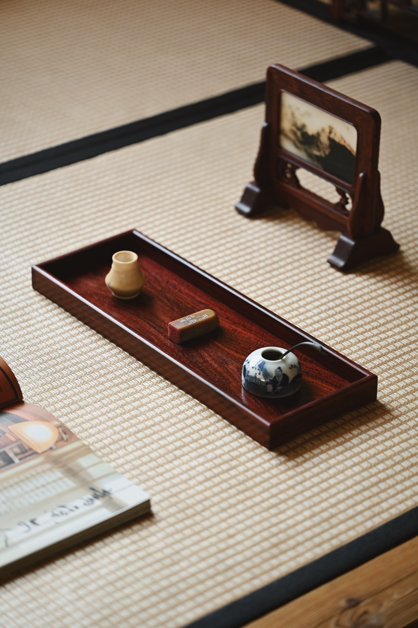 紫檀独板 | 清意 水波纹文盘独板制,色泽温润,水波纹理分明,层次起伏变化,似水波涟漪,颇合画意,可作为文房承盘,亦可用于茶室。39*14*2.8cm 445g