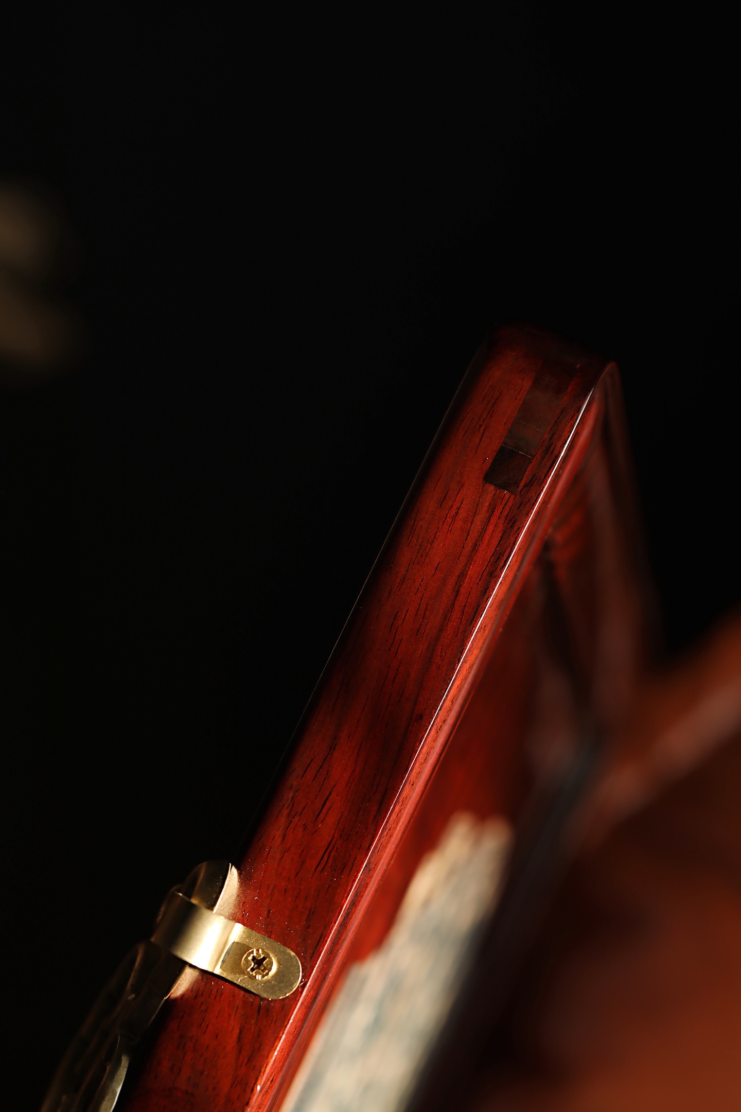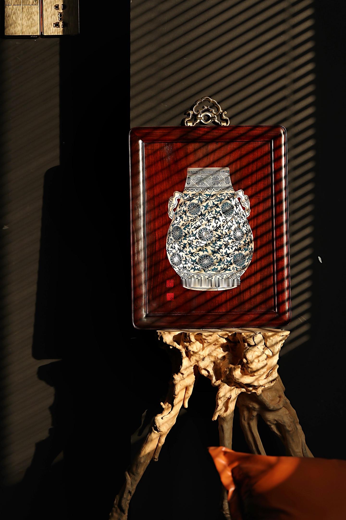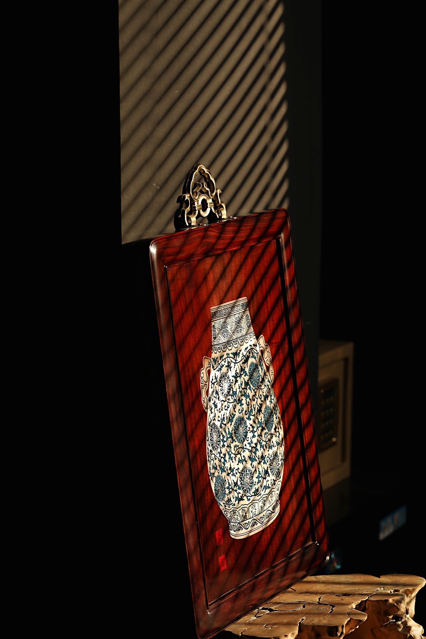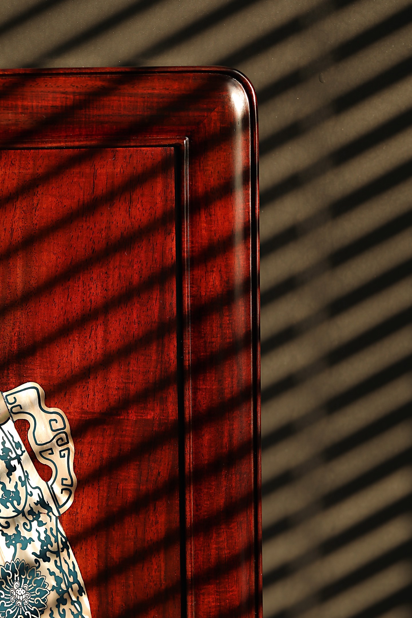 老挝大红酸枝独板×螺钿 | 青花瓷韵 挂屏精选独板,料质细腻红润,纹饰在螺钿上仿青花绘成,工精纹细,光华熠熠,居家装饰,平安吉祥。48.5*33*2.5cm