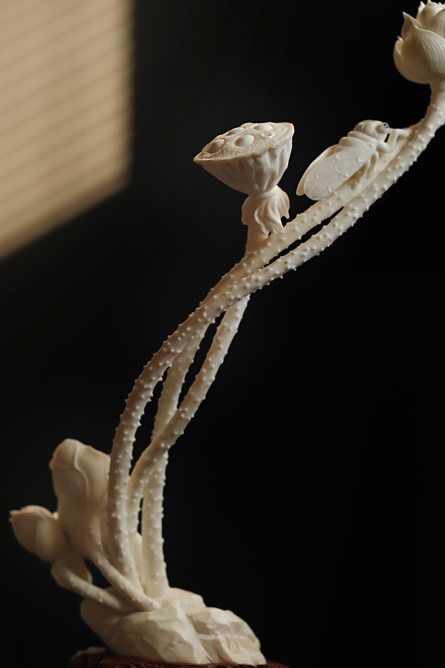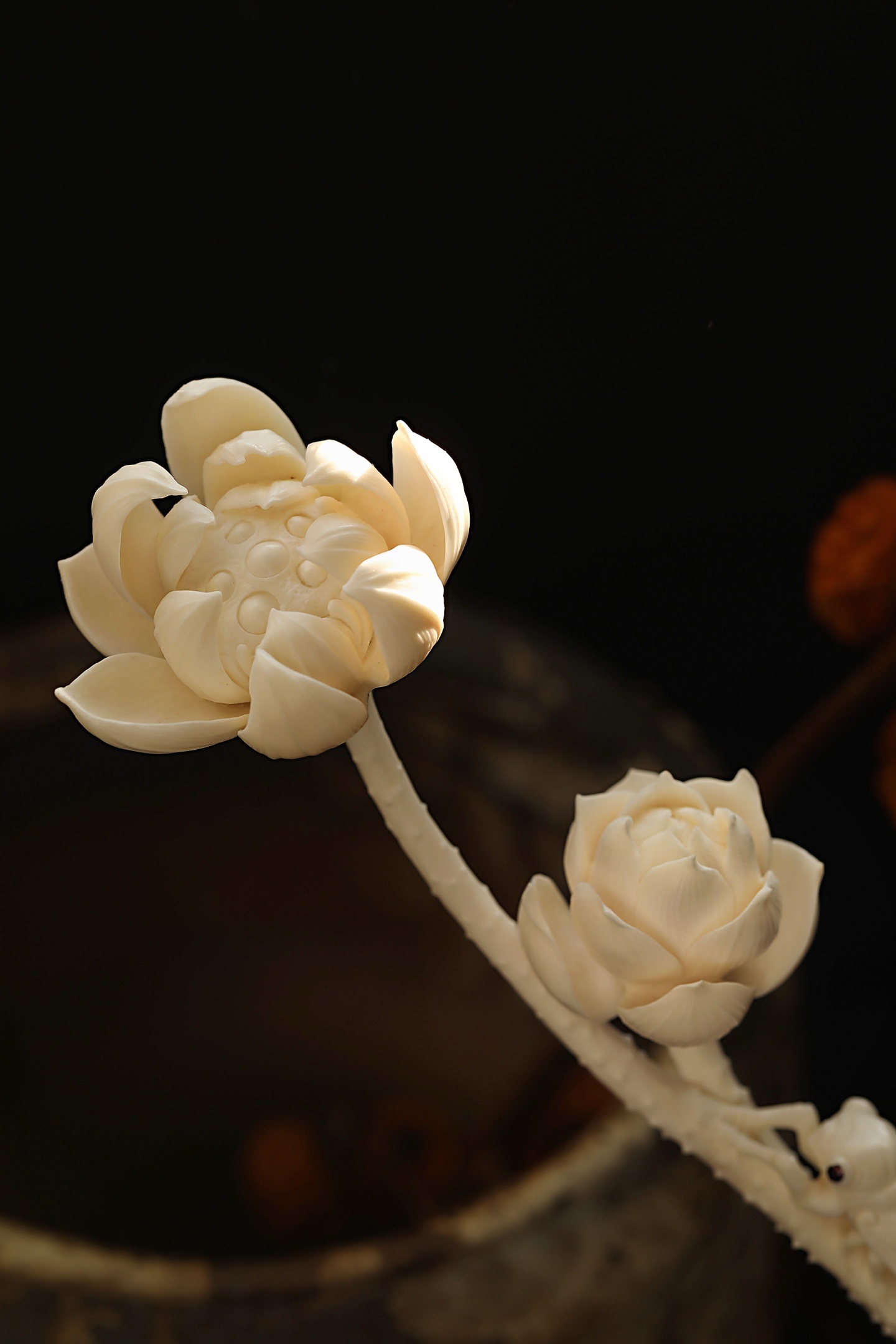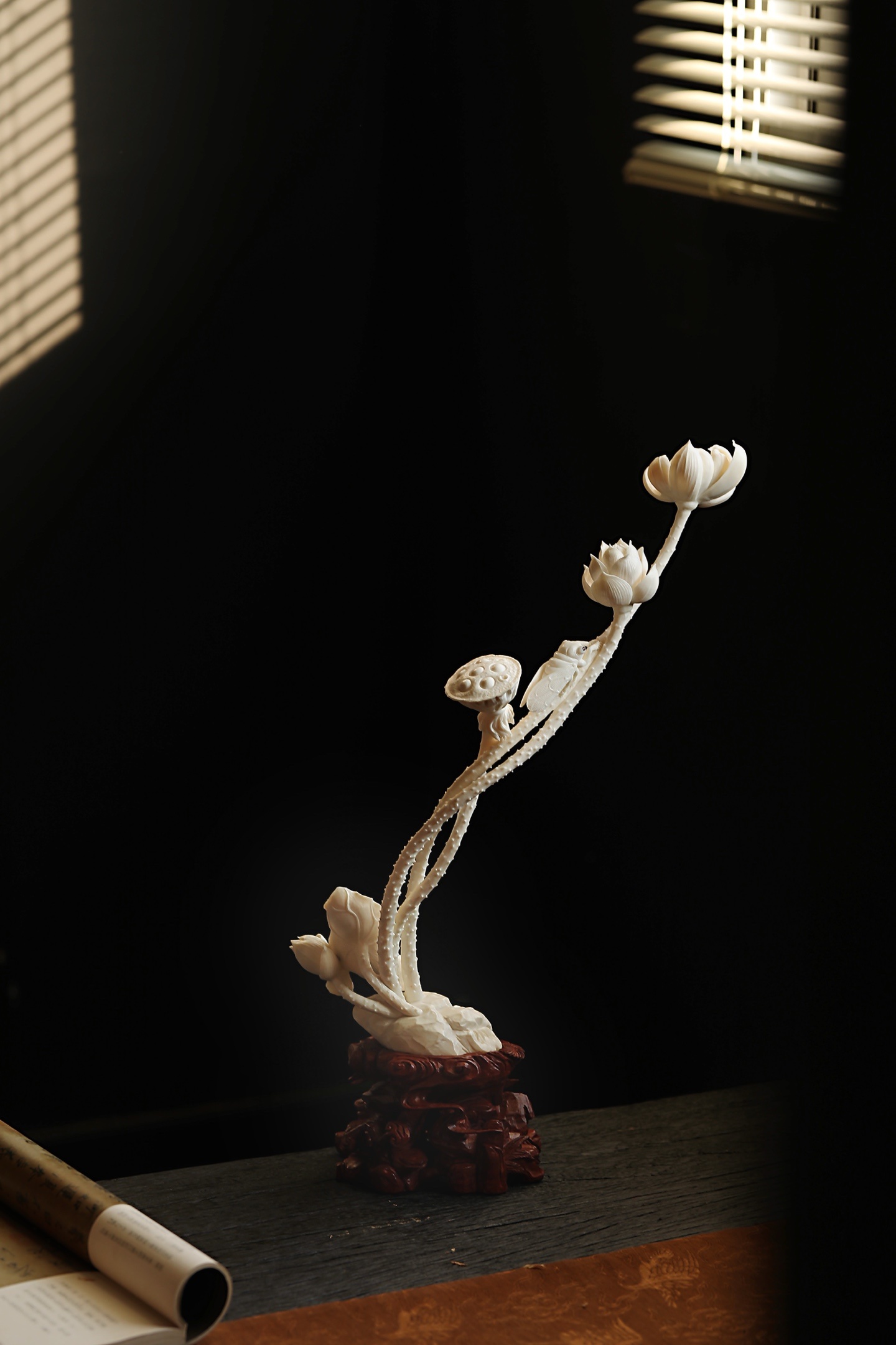 鹿角 | 和和美美/出水芙蓉整料循形创作,构思巧妙,以天然鹿角雕琢出荷塘清韵,寓意和和美美。出淤泥而不染,濯清涟而不妖——作品承袭这份高洁,于温润质地上绽放一池风雅。质细腻如凝脂,型材大器敦厚。荷花花瓣光滑莹润,似含朝露;莲叶舒卷翻飞,曼妙婀娜。细观之,仿佛能听见清风拂过荷塘的细语,看见水珠在叶心流转的光泽。整作宛若将夏日荷塘凝固永恒,亭亭净植,娇而不媚。置于案头,恍若引一缕清芬入室,得半日闲适于心。