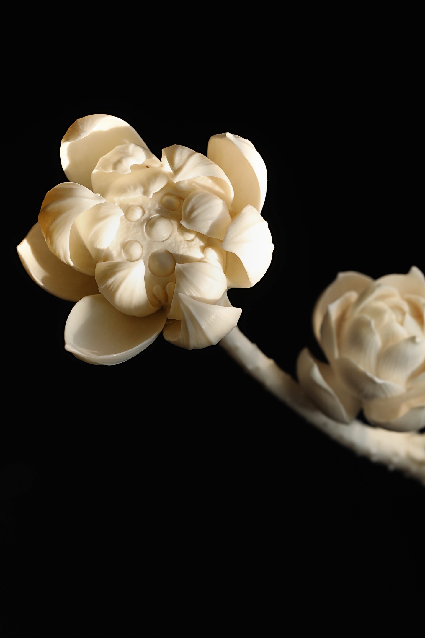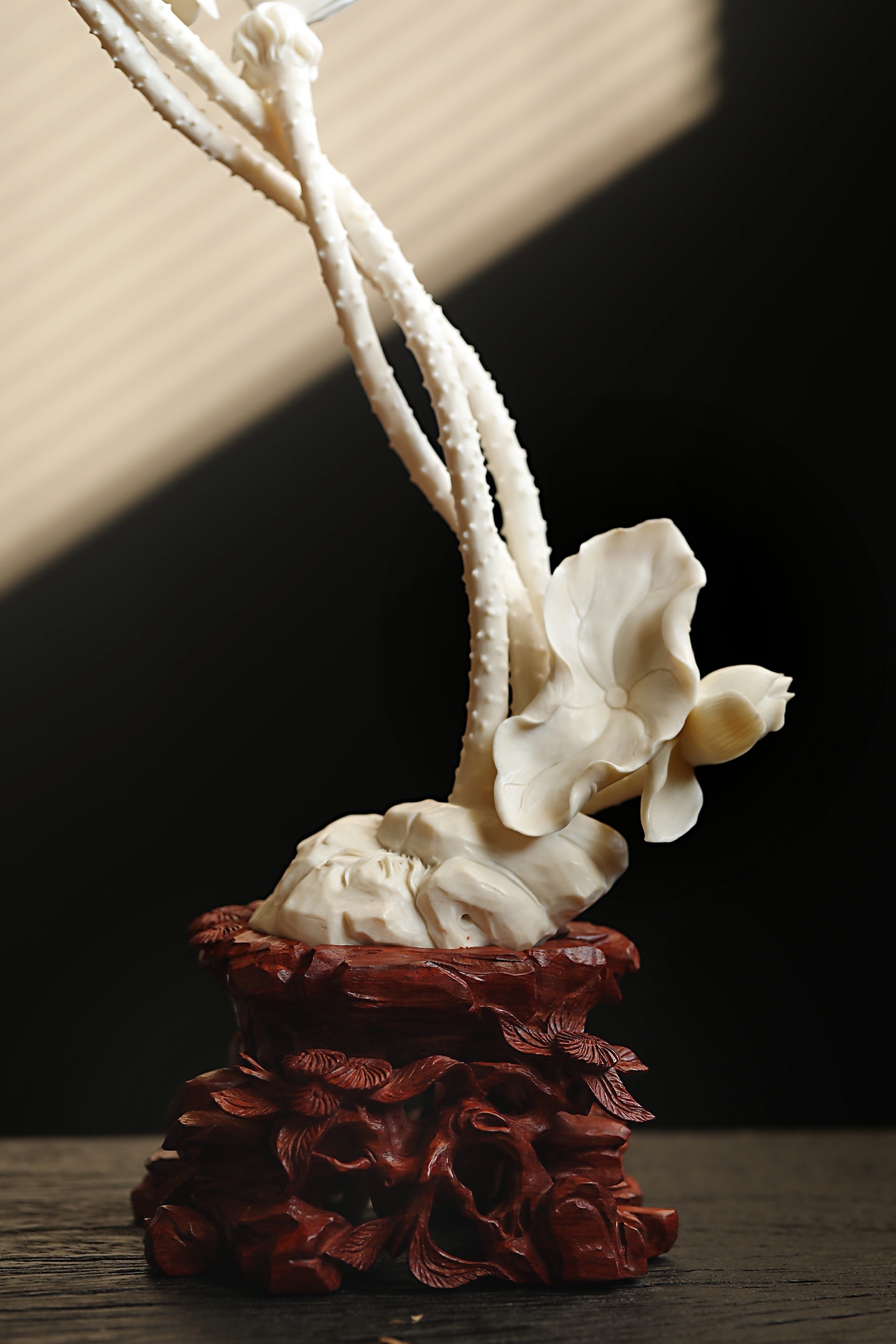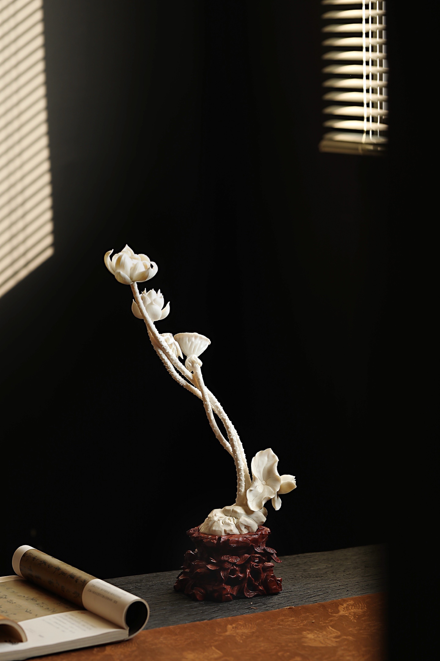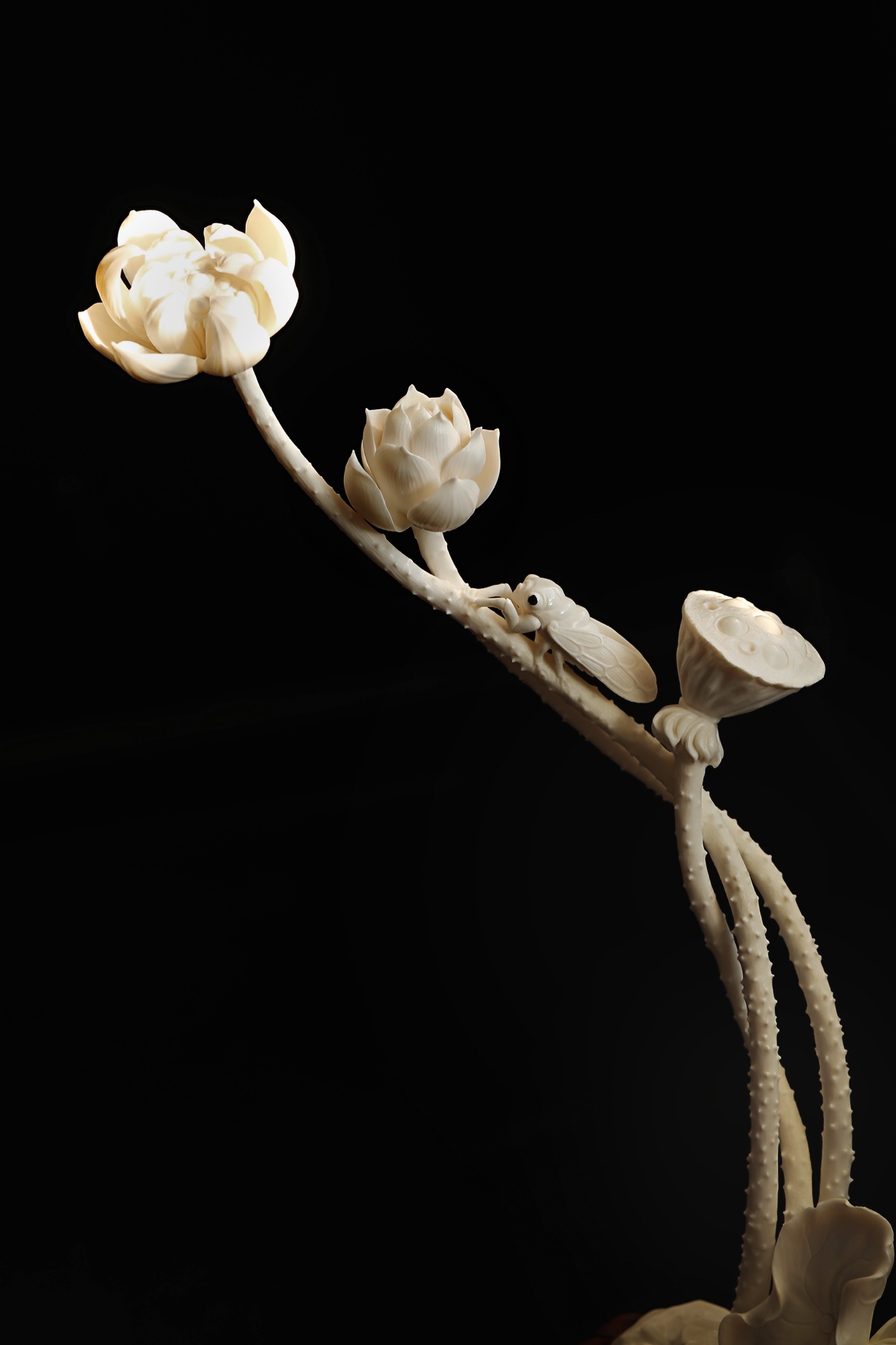 鹿角 | 和和美美/出水芙蓉整料循形创作,构思巧妙,以天然鹿角雕琢出荷塘清韵,寓意和和美美。出淤泥而不染,濯清涟而不妖——作品承袭这份高洁,于温润质地上绽放一池风雅。质细腻如凝脂,型材大器敦厚。荷花花瓣光滑莹润,似含朝露;莲叶舒卷翻飞,曼妙婀娜。细观之,仿佛能听见清风拂过荷塘的细语,看见水珠在叶心流转的光泽。整作宛若将夏日荷塘凝固永恒,亭亭净植,娇而不媚。置于案头,恍若引一缕清芬入室,得半日闲适于心。