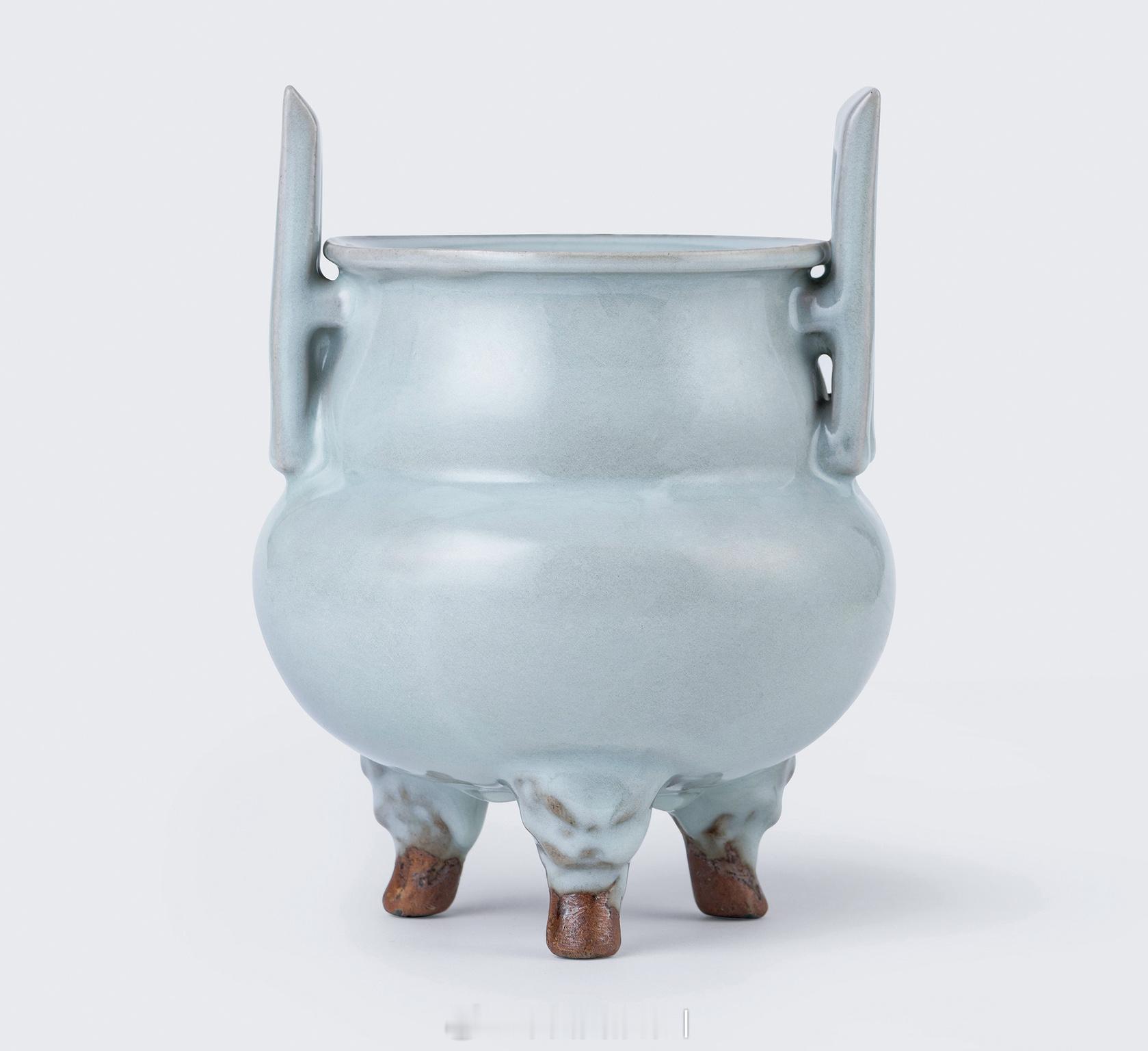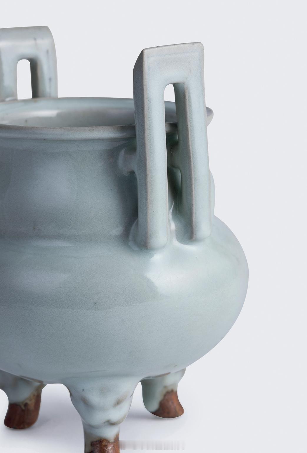 元/明 月白釉冲耳三足炉此炉体量较大,造型挺拔端庄。平口内倾,折沿。微束颈,两侧贴塑长板状冲天耳,中间长方形镂空,耳顶内斜。此类方耳为元代不同尺寸、不同窑口三足炉的共通形制,时代风格使然。圆鼓腹稍扁,底部中央圆形内凹。三兽足承托器身,较同类器稍显修长,无笨拙之感。通体施月白色釉,釉层肥厚丰腴,釉质莹润光洁。足端无釉,胎质细腻坚致,包浆油润。 纵观此炉,形制基本符合元代此类香炉特徵,但细节处又略显考究、规范,可能为元明过渡期产物。另外,相类者多贴塑装饰、炉底涩胎,如故宫博物院、内蒙古博物院藏品等,素身满釉且凭釉色取胜者并不多见。又古窑作大器容易变形走样,而此器敦实厚重却不失协调匀称,不知几中拣一,殊为难得。尺寸:22.5 cm来源:中国嘉德