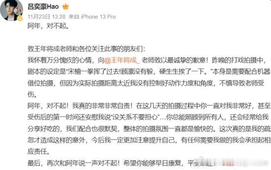 短剧演员拍戏被真打 对手演员未摘除坚硬饰品短剧演员王年将成在拍戏时疑似被对手演员真打受伤,视频中可听见打到脸时很大一声,随即王年将成捂脸险些倒下,迟迟没有缓过来。稍晚,他发博公开眼部淤紫肿胀照片,称已到酒店,“大家别担心,会好好休息!!!”王年将成拍摄打戏时,对手演员吕奕豪未摘除佩戴的坚硬饰品(疑似戒指),在借位拍摄环节直击其左眼。现场视频记录下巨大撞击声,王年将成捂眼倒地近20秒无工作人员施救,最终造成1厘米撕裂性伤口需缝针治疗,左眼淤紫肿胀无法睁开。剧组被曝为压缩成本未配备专业武指及医疗人员。随后对手戏演员吕奕豪也发文致歉。