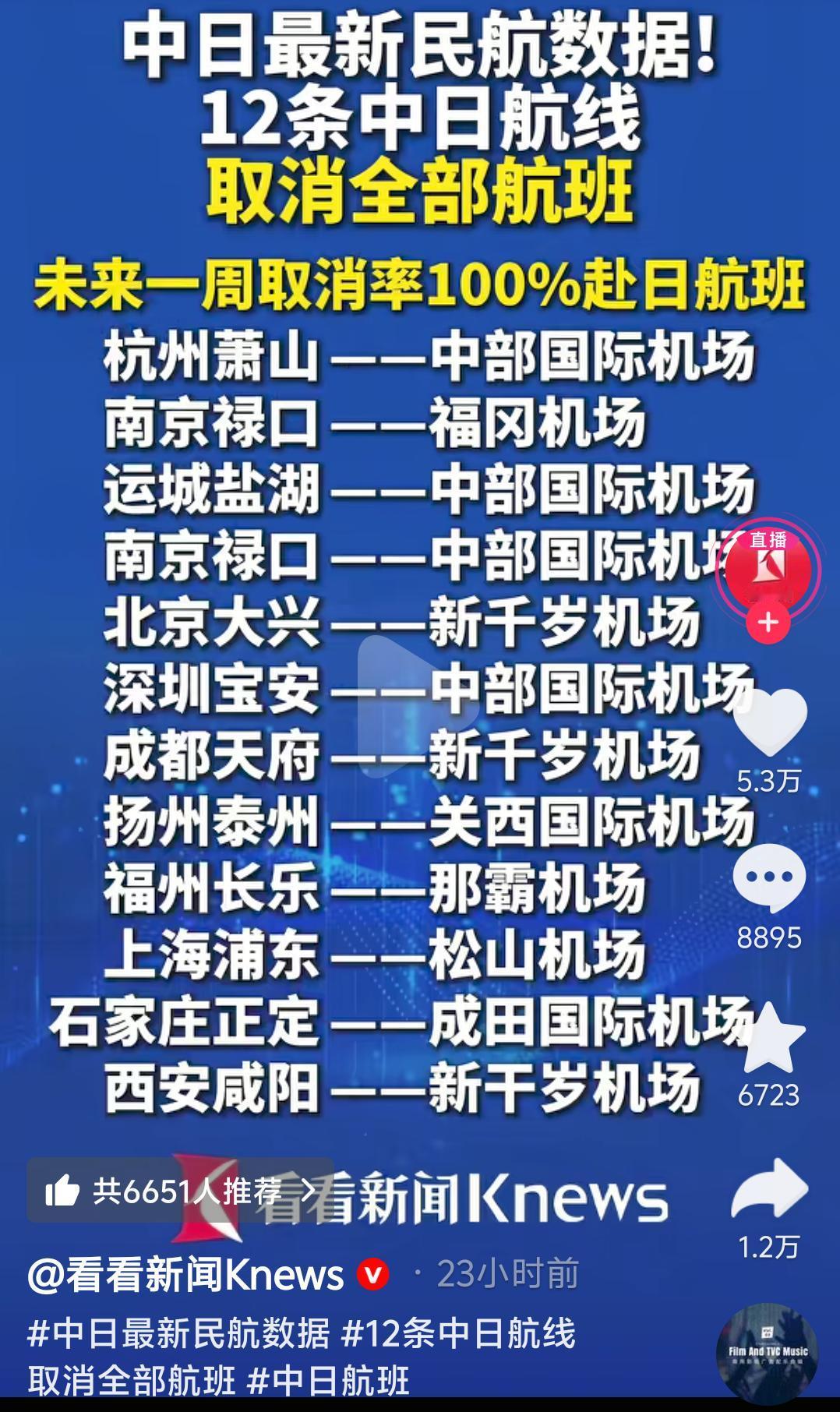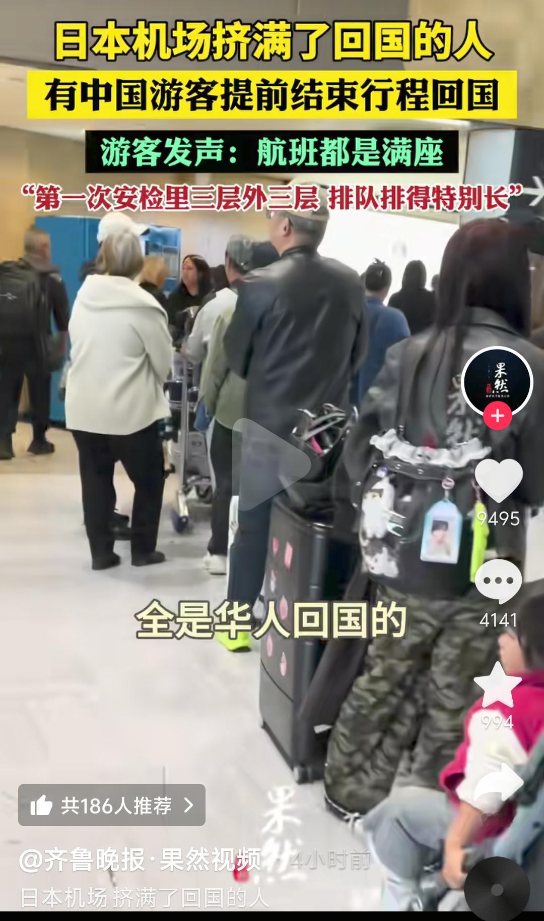 突发!12条中日航线停飞,日本机场归国潮刷屏 12条中日直飞航线集体取消,天津至关西航线取消率飙至65%,未来一周取消率将达21.6%创月内新高!日本成田、羽田机场挤满拎着行囊的中国人,值机队伍蜿蜒如春运,回国航班一票难求、票价暴涨50%。 这波异动背后,是日本首相涉台挑衅引发的局势紧张,中方严正交涉后,航司密集缩容、民众扎堆归国。从航线停摆到民间避险,信号已然清晰:主权红线不容触碰,和平从不是妥协而来。你觉得局势会如何发展?