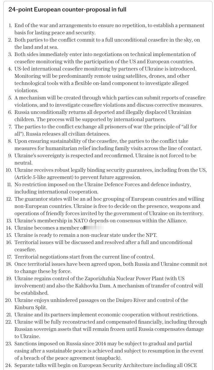 英国《电讯报》发表了欧盟最新提出的结束俄乌冲突的“二十四条”方案全文: 1. 结束战争,并做出安排以确保冲突不再重演,为持久和平与安全建立永久基础。 2. 冲突双方承诺在陆、海、空实现全面无条件停火。 3. 双方在美国和欧洲国家的参与下,立即就停火监督的技术实施问题进行谈判。 4. 引入由美国主导、乌克兰伙伴国参与的国际停火监督。监督将主要远程进行,使用卫星、无人机及其他技术工具,并辅以灵活的实地核查以调查据称的违规行为。 5. 建立一个机制,各方可通过该机制提交停火违规报告,并用以调查违规行为及讨论纠正措施。 6. 俄罗斯无条件遣返所有被驱逐及非法转移的乌克兰儿童,该进程将得到国际伙伴的支持。 7. 冲突双方交换所有战俘(遵循"全部换全部"原则),俄罗斯释放所有被扣押的平民。 8. 在确保停火可持续后,冲突双方采取措施进行人道主义救助,包括允许跨越接触线进行家属探视。 9. 乌克兰的主权得到尊重并再次确认。乌克兰不会被强迫保持中立。 10. 乌克兰获得强有力的、具有法律约束力的安全保障(包括来自美国的、类似《北大西洋公约》第五条的协议),以防止未来的侵略。 11. 对乌克兰国防部队及国防工业(包括国际合作)不施加任何限制。 12. 担保国将是一个由欧洲国家及有意愿的非欧洲国家组成的特设集团。乌克兰可自由决定其境内受邀友好部队的存在、武器及行动。 13. 乌克兰加入北约的问题取决于北约内部的共识。 14. 乌克兰成为欧盟成员国。 15. 乌克兰准备在《不扩散核武器条约》下继续保持无核国家地位。 16. 领土问题将在全面无条件停火后进行讨论和解决。 17. 领土谈判以当前实际控制线为起点。 18. 一旦领土问题达成协议,俄罗斯和乌克兰均承诺不以武力改变这些安排。 19. 乌克兰恢复对扎波罗热核电站(在美国参与下)以及卡霍夫卡水坝的控制。将建立一个控制权移交机制。 20. 乌克兰在第聂伯河上享有不受阻碍的通行权并控制金伯恩沙嘴。 21. 乌克兰及其伙伴国在不受限制的情况下实施经济合作。 22. 乌克兰将得到全面重建和资金补偿,包括通过仍将冻结直至俄罗斯赔偿对乌克兰造成的损害的俄罗斯主权资产来实现。 23. 自2014年起对俄罗斯实施的制裁,在实现可持续和平后,可逐步部分放宽;若违反和平协议,则恢复制裁("快速恢复"机制)。 24. 将开始就包括所有欧安组织成员国在内的欧洲安全架构进行单独谈判。