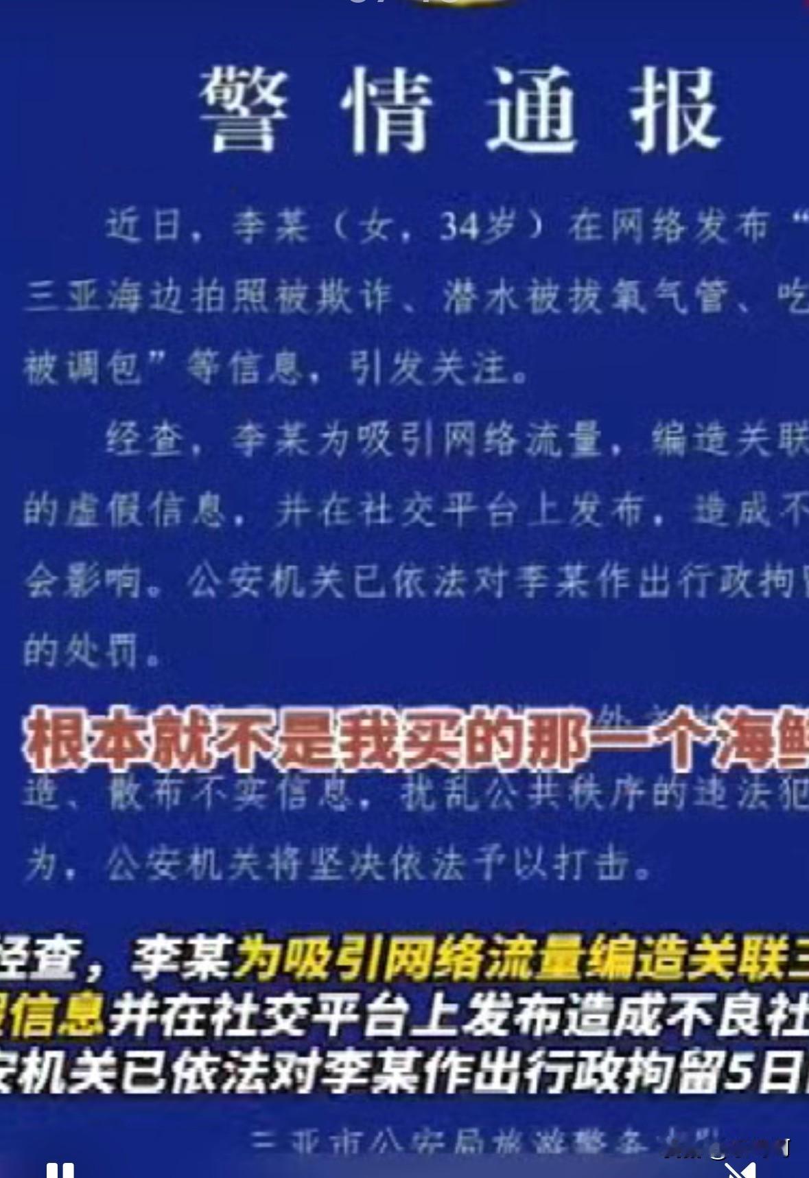 “无底线炒作被拘留5日”!11月23日海南三亚公安对前几日发布虚假视频的李某作出了行政拘留的处罚。 近日,李某在社交网站上发视频称,自己在海南旅游时,自己带过去吃的海鲜被调包、拍照被欺诈、甚至在三亚潜水时被拔氧气管等事件。 此视频发到平台后,立即被大量转发众多网友也纷纷关注,相关话题的阅读量超过2亿,李某的这一虚假视频也给当地造成了巨大的负面影响。 当地的旅游部门也在网上看到了这个视频,为了确实是否属实,马上联系李某,请她提供相关的证据资料。 李某的相关视频都是拼凑出来的,哪有相关的证据呢? 面对警方的调查,李某承认,她是为了流量而刻意编造了这段视频。 网络非法外之地,不能为了网络流量而随意造假。等待李某的是法律的制裁! 取材网络,侵删