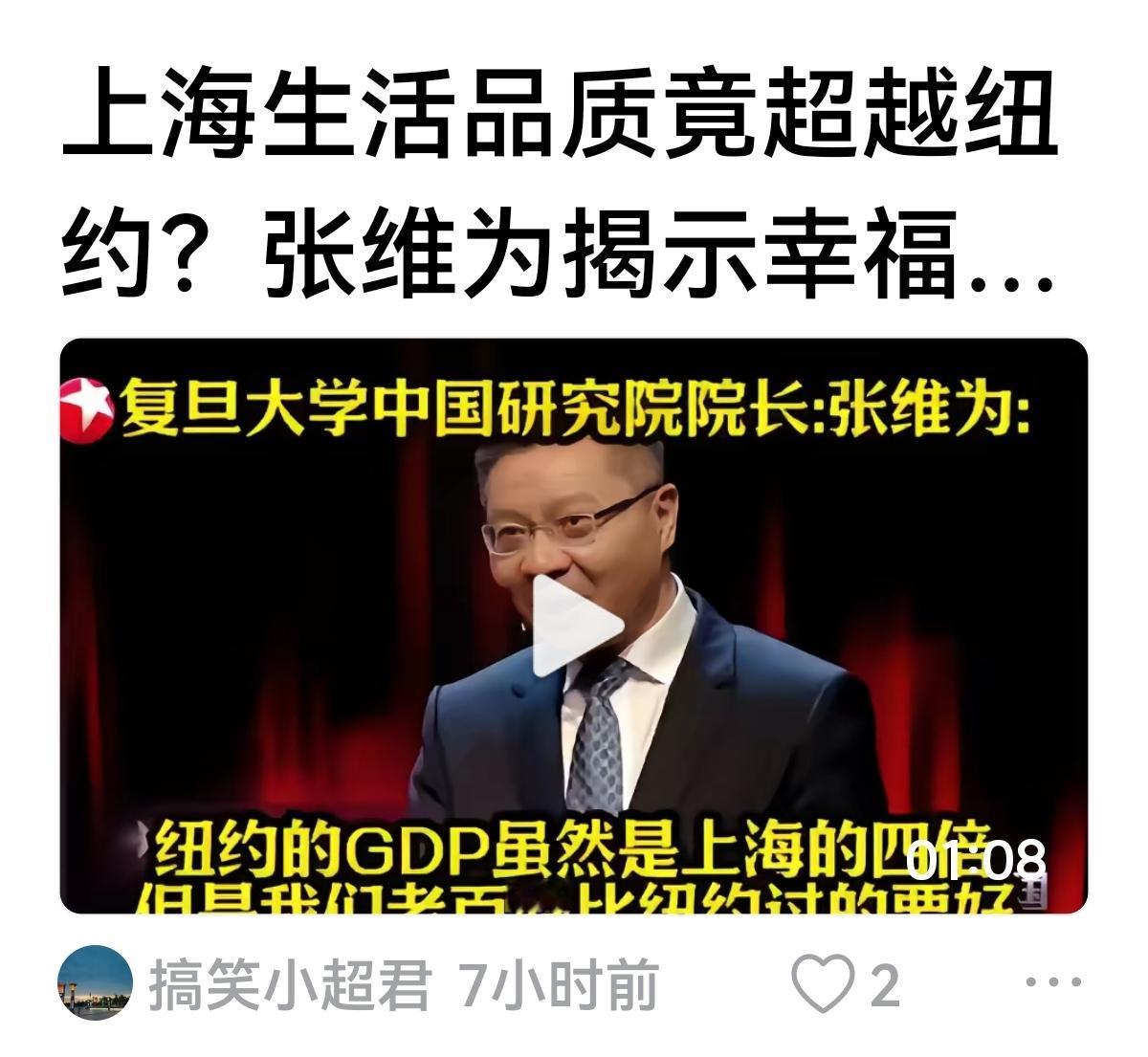【张维为:上海与纽约对比】 张维为:虽然纽约GDP超过上海四倍。 但是,关键是看社会指标:中位家庭的净资产,人均寿命,社会治安,对自己所在未来的未来乐不乐观等等。 上海明显好于纽约,尤其上海街上开的车,手机,家用电器等等都比纽约好。 看来去美国留学,都是去扶贫? 昨天还看见明星沙溢把孩子送到美国念书,以后要改变思路,他们送孩子是去艰苦,危险的地方锻炼身体!