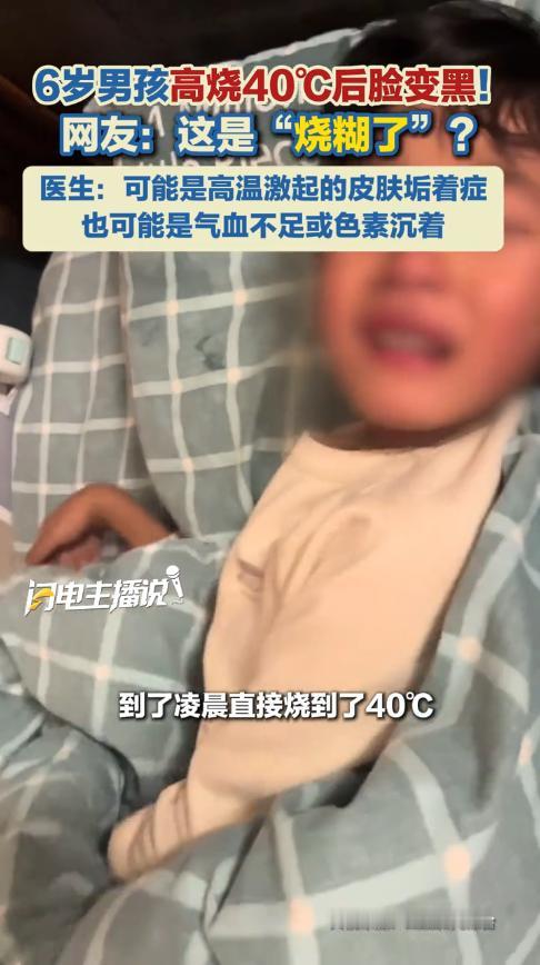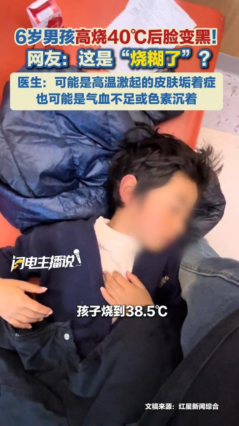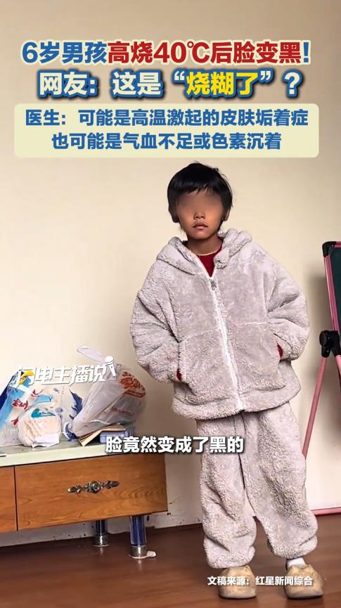 活久见!近日,湖南衡阳,一6岁男孩发烧到38.5℃,虽然吃了退烧药,可到了凌晨,男孩的体温飙到40℃!妈妈急忙带孩子去医院,可打了退烧针后还是反复起热,十几个小时后,男孩的皮肤更是变成了黑色!网友:这是烧糊了? 小孩子的抵抗力较差,再加上这几天气温忽高忽低的,不少小朋友都感冒了,这时候家长一定要重视起来,因为小孩子最怕发烧,务必及时就医。 据媒体11月24日的报道,当天下午,卢女士回家后,发现儿子一副无精打采的样子,于是她就测了下孩子的体温,没想到高烧38.5℃,好在家里有常备的退烧药,卢女士急忙喂给了孩子。 本以为吃过药后就能控制住病情,没想到孩子还是一直感觉不舒服,到了凌晨时分,卢女士又给孩子量了一遍体温,这次竟然烧到了40℃! 不敢再耽搁了,卢女士急忙抱着孩子去医院治疗,医生立即给小孩注射了退烧针,可是孩子仍然反复发烧,更令卢女士没想到的是,儿子的皮肤逐渐变黑,最终虽然退了烧,但是肤色却没变回来。 卢女士将自己的经历发到网上,很快就引起了网友们的关注,不少人觉得这是被烧糊了,还有人指出应该是孩子气血不足导致的。 大家觉得是什么原因引起的呢? 信息来源:《男孩高烧十几个小时后脸变黑,至今未恢复!并非个例,医生提醒→》半岛晨报