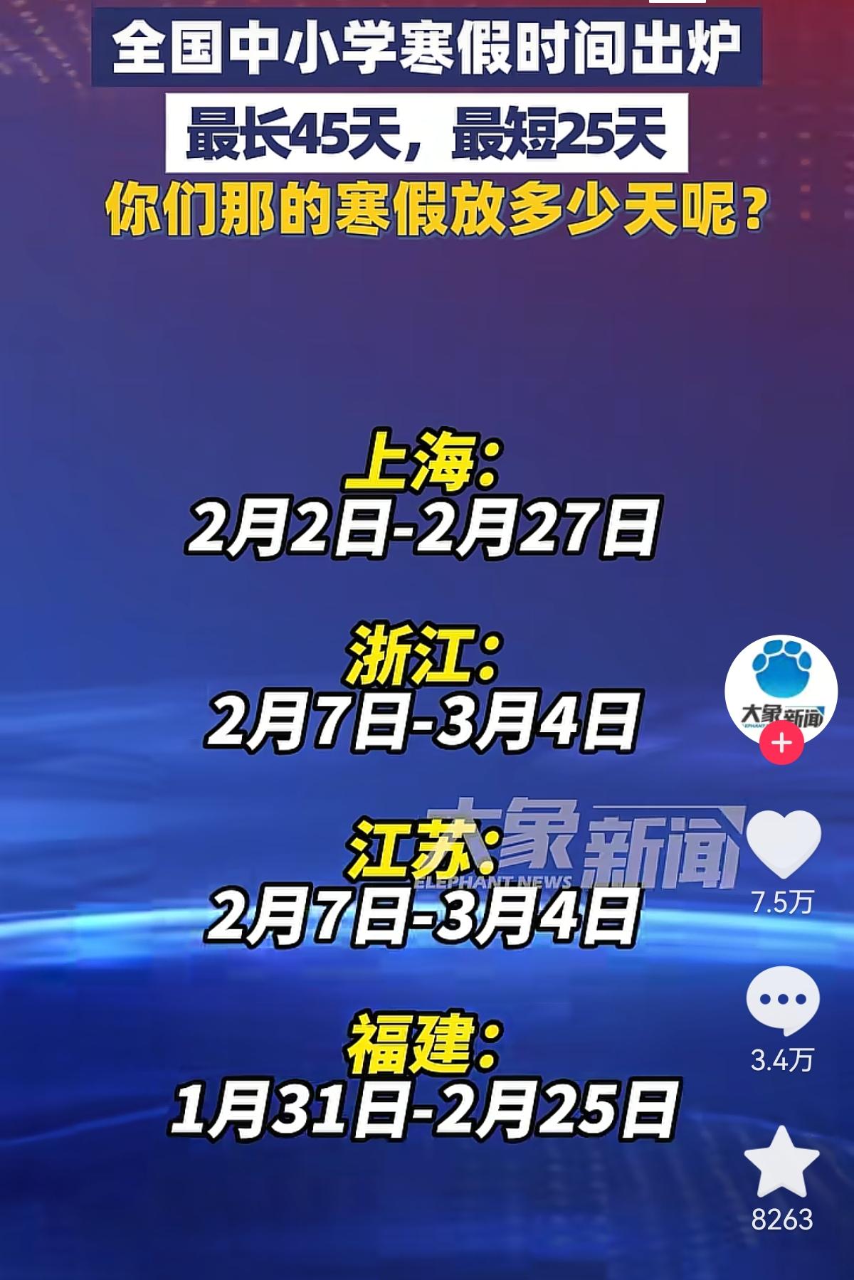 最长寒假辽宁遥遥领先,45天! 而吉林和黑龙江有43天, 这东北三省冬季寒冷放得久我能理解, 可是海南这44天排第二是什么意思? 冬季的海南不是挺温暖舒适吗? 放那么长的寒假是干啥呀? 谁来解释一下! 最短的只有25天, 分别是上海、浙江、江苏和福建! 看到这样的假期, 是不是挺羡慕教师这个职业的?