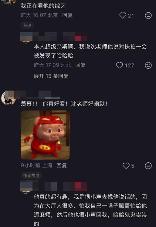 有网友在滑雪场偶遇了沈腾,当时是在大厅,人比较多,这个网友不敢大声喊。 而是非常聪明地走到沈腾旁边,小声问他,“你是不是沈叔叔?” 沈腾也“鬼鬼祟祟”,很小声地回复道,“对对对,快拍,一会被人发现了~” 不仅满足了网友的合照请求,还这么有梗。 不得不说,沈腾真是天生的喜剧演员! 他的幽默不是刻意设计出来的,而是随时随地就能散发出来。 这样的天赋型演员,其他人就算再努力,也很难达到他的高啊。