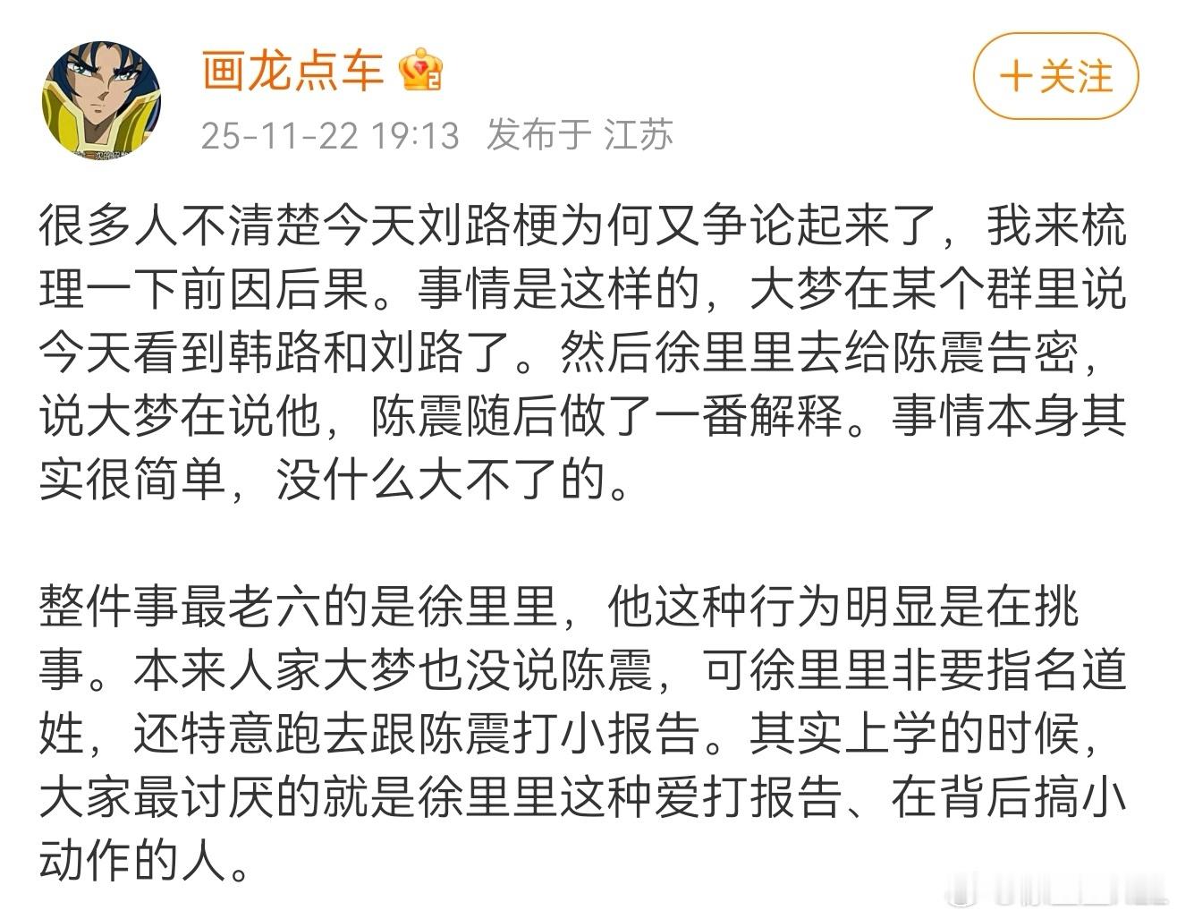 啥?怎么成我告密了?我都不在人家群里我怎么告密?这件事是告密的问题吗?核心问题难道不是大梦在一个厂家的工作活动群里嘴碎聊刘路和韩路吗?核心问题难道不是职业道德问题吗?这群人招人烦的地方就在这。并且还抓不住问题的重点。