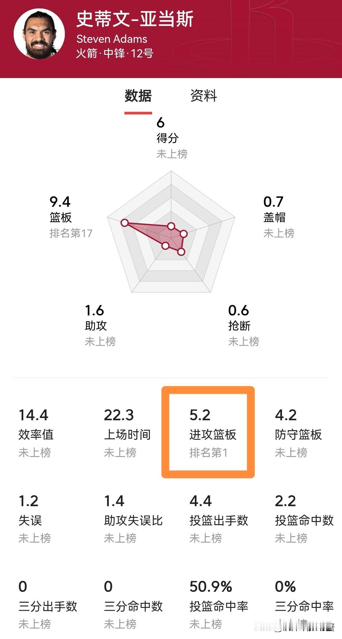 火箭老将亚当斯不愧是进攻篮板的代名词!在今天火箭客场以114:92大胜太阳的比赛中,亚当斯仅仅替补出战16分钟就抢到了3个前场篮板,高居全队第一。 整场比赛下来,亚当斯替补出战16分钟,投篮4中2,其中罚球2中2得到6分7篮板,他的场上正负值为+6。 值得一提的是,自从新赛季开赛以来,火箭以场均16.5个进攻篮板高居联盟第一,其中亚当斯的场均进攻篮板为5.2个,同样高居联盟第一。