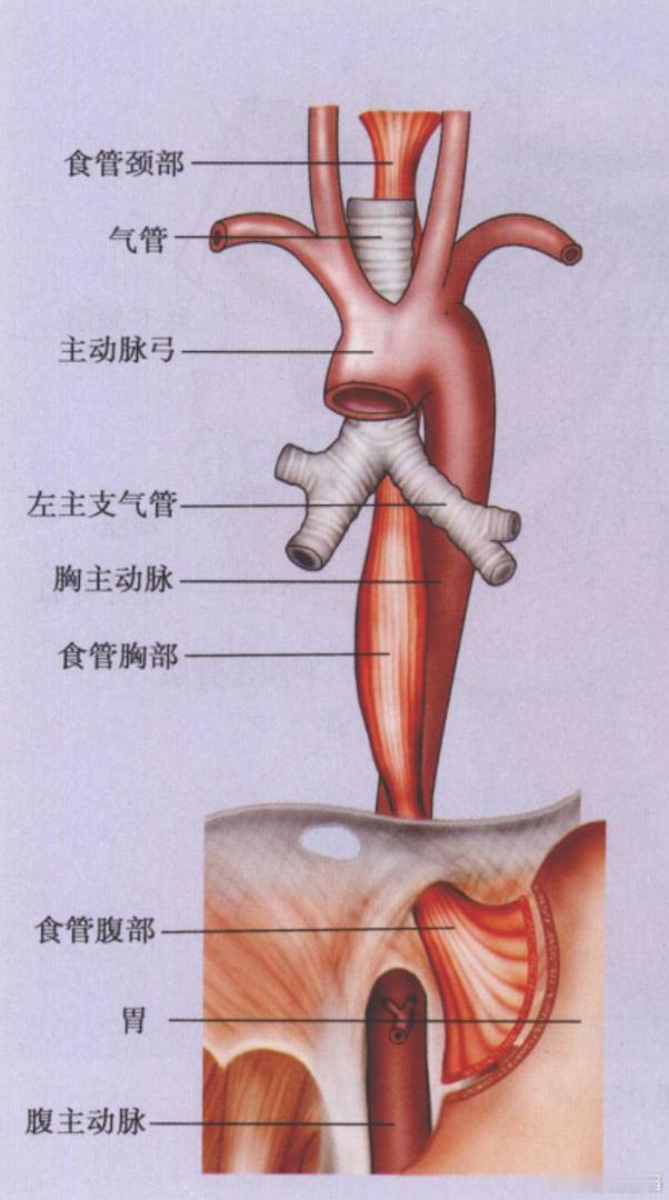 食管异物主要容易卡在食管的两个地方,食管入口,主动脉弓旁的食管狭窄,最凶险是卡在主动脉弓旁,然后刺破食管,甚至刺破主动脉。食管入口位于喉结下方,胸骨柄上缘水平,相当于第6颈椎体下缘平面,其周围有多个重要器官:前方:有气管,两者之间仅由薄层结缔组织分隔。后方 :邻颈椎体,两者之间有食管后间隙,间隙内有疏松结缔组织。两侧 :有甲状腺侧叶、颈动脉鞘。颈动脉鞘内有颈总动脉、颈内静脉和迷走神经。左前方:有主动脉弓、无名静脉、锁骨下动脉等大血管。上方:与咽部相连,食管入口位于喉咽部,吞咽时,会厌软骨可防止食物进入气管。