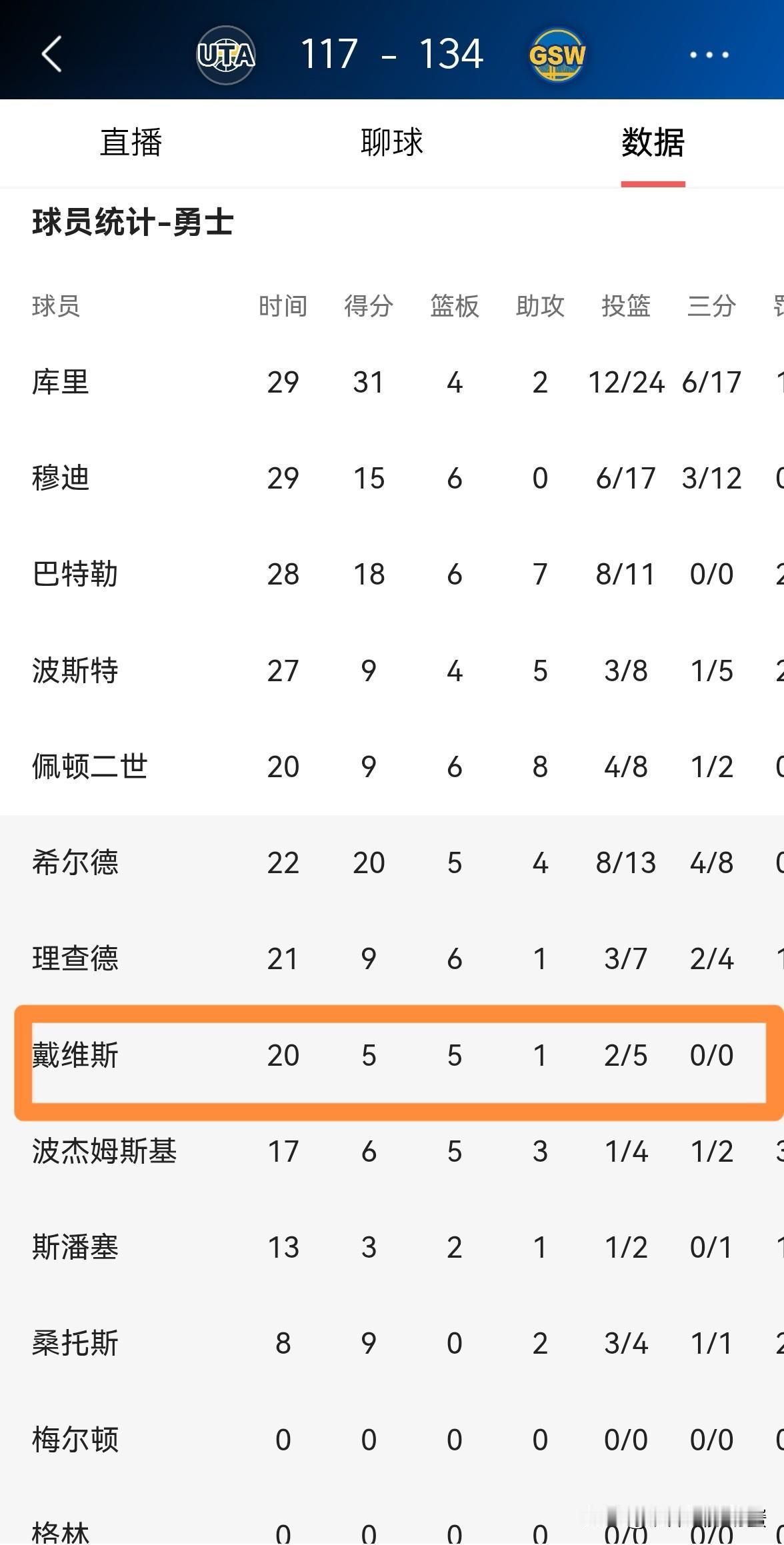 勇士中锋TJD真是扶不起来的阿斗!在今天勇士主场以134:117大胜爵士的比赛中,TJD破天荒的得到了20分钟的上场时间,可是他却用糟糕的表现辜负了主帅科尔的信任。 全场比赛下来,TJD替补出战20分钟,投篮5中2得到5分5篮板,他的场上正负值为全队第二低的-7。 TJD最大的问题依然出现在防守端,他的单防、协防和护筐能力都非常一般,毫不夸张的说,如果勇士遇到了联盟的顶级强队,TJD绝对不会获得这么多的上场时间,他就像阿斗一样扶不起来。