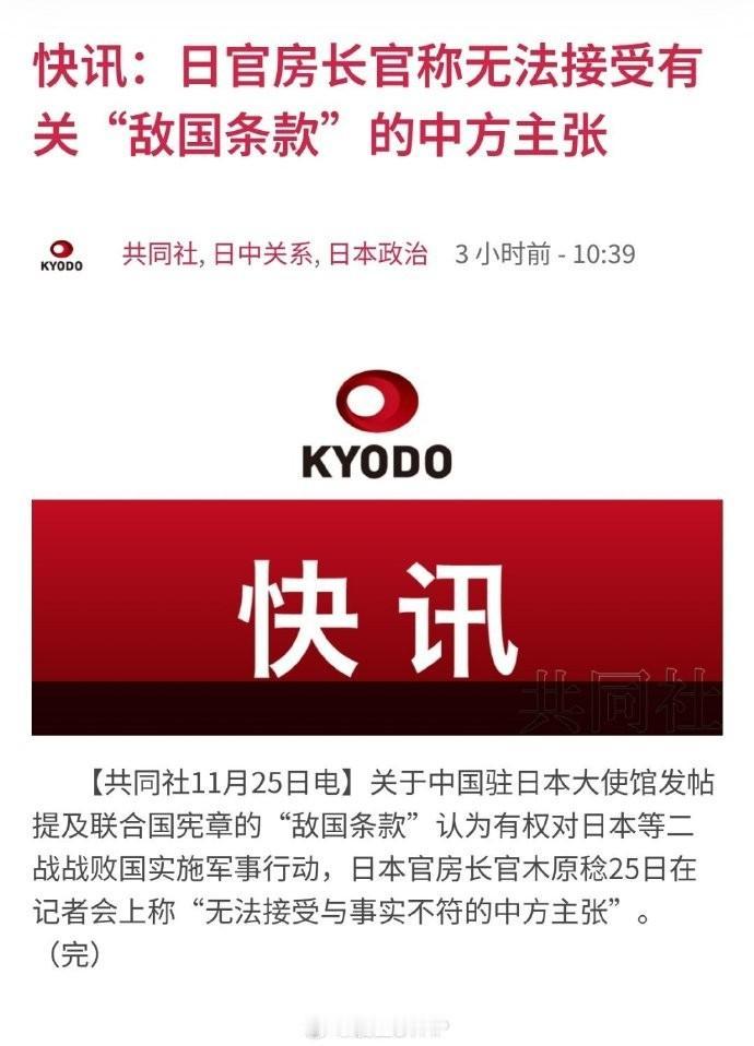 反了日本了,叫嚣不接受“敌国条款”主张,五大战胜国这能忍? 联合国宪章,什么时候有战败国插嘴的份?据日本共同社报道,日本官房长官木原稔在记者会上公然宣称不接受中方有关“敌国条款”的主张,称这与事实不符。 那么中方的主张是什么呢?中方作为联合国创始会员国之一、安理会五常之一,只是重申了一下联合国宪章中存在“敌国条款”的内容。既然日本称“与事实不符”,也就是在直接否认“敌国条款”,如此嚣张,二战的五大战胜国这能忍? 这是日本近期第二次否认“敌国条款”,前几天日本外务省宣称“敌国条款”已经失效,这两天官房长官又否认“敌国条款”,联合国宪章这么神圣重大的内容,什么时候成了战败国想承认就承认,不想承认就扔一边的东西了? 日本还向联合国秘书长古铁雷斯发出一封信,“倒打一耙”指责中国对“敌国条款”的“断言”,“似乎与事实不符”。显然连日本自己没胆量否认,只能用一些似是而非的口吻来表述。接着他们又扯了一堆国内法,说什么“日本基本防卫政策是被动防卫”,把自己打扮成受害者的模样。 然而日本的恶劣行为,以及对华丑恶的叫嚣,和他们在信中所说是完全不同的,日本铁了心想要干涉台湾,又不敢承担后果,只好在联合国玩这种文字游戏。 因此,有必要再次给日本人“科普”一下“敌国条款”到底是什么了。敌国条款是由3条《联合国宪章》条款构成,明确“敌国”就是指德、日、意等轴心国;同时规定,若敌国再次侵略,不需安理会授权可对其发动军事行动阻止侵略手段。 而日本东拉西扯大半天,其核心就是想要将“武力干涉台湾”从“侵略行为”中摘出去,中方重提“敌国条款”就是对日本发出最后警告,日本要胆敢越雷池一步,中国有权直接对其发动军事行动。 而且日本也应该明白,中国作为二战主要胜利者、联合国创始会员国、联合国安理会五常国家,有权力按照中国对联合国宪章的理解和解释,对一切想要破坏世界和平的势力发动战争,日本人想要狡辩,不如等到了战场上,跟中国的导弹、军舰和战机去解释吧。