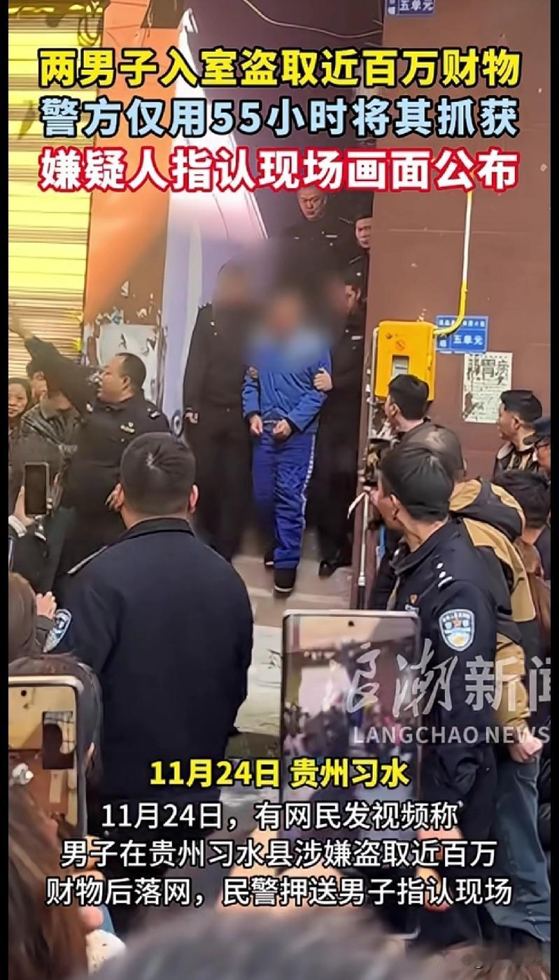 贵州这俩小偷也太“倒霉”了!偷了近百万,55小时就被警察按了! 11月24日贵州习水这事儿,看完只想说:警察蜀黍这速度,简直是“闪电破案”! 俩男的入室偷了近百万财物,本以为能潇洒跑路,结果刚得手没超过55小时,就被警察堵个正着!现在都被押着指认现场了,周围全是围观的人,这脸可算丢尽了。 偷这么多钱,还没焐热就进局子,这波“赔本买卖”做得也太亏了!咱就是说,别心存侥幸干违法的事儿,警察的速度永远比你逃跑的脚步快! 这也给大家提个醒:家里贵重物品多留点心,真遇着事儿第一时间报警,警察绝对靠谱!