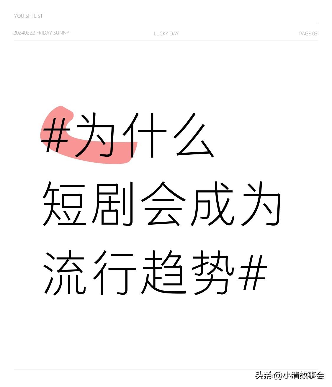 为什么短剧会成为流行趋势 短剧成流行趋势,原因跟快餐受欢迎类似,藏在生活节奏、审美和需求里。 生活节奏快,谁愿意花数小时追长剧?短剧就像能量饮料,能让人利用碎片时间开启“心灵之旅”。在公交、地铁上随时能看,把故事浓缩,让人看得痛快。 短剧内容也贴近年轻人审美。幽默、温馨、搞笑、悬疑等元素,像快闪演唱会,瞬间点燃情绪,用有限时间讲无限故事。 而且短剧容易“爆款”。社交媒体助推下,靠梗、段子和神转折制造话题,引发全民追剧。再加上平台精准推送,制作成本低、盈利模式多,2024年产业规模超500亿,想不火都难。