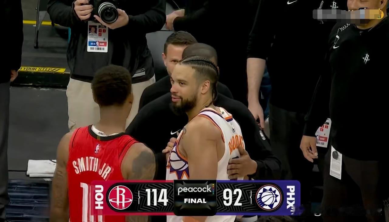 在今天火箭客场以114:92大胜太阳的赛后,发生了特别有趣的一幕。当比赛结束以后,火箭众将纷纷和前队友狄龙拥抱致意,小史密斯自然也不例外。可是当小史密斯伸出手想要和狄龙拥抱的时候,狄龙却被阿门-汤普森叫住了,就这样小史密斯等呀等,等了好大一会儿之后他终于获得了和狄龙拥抱致意的机会,之后两人做了长时间的交流。