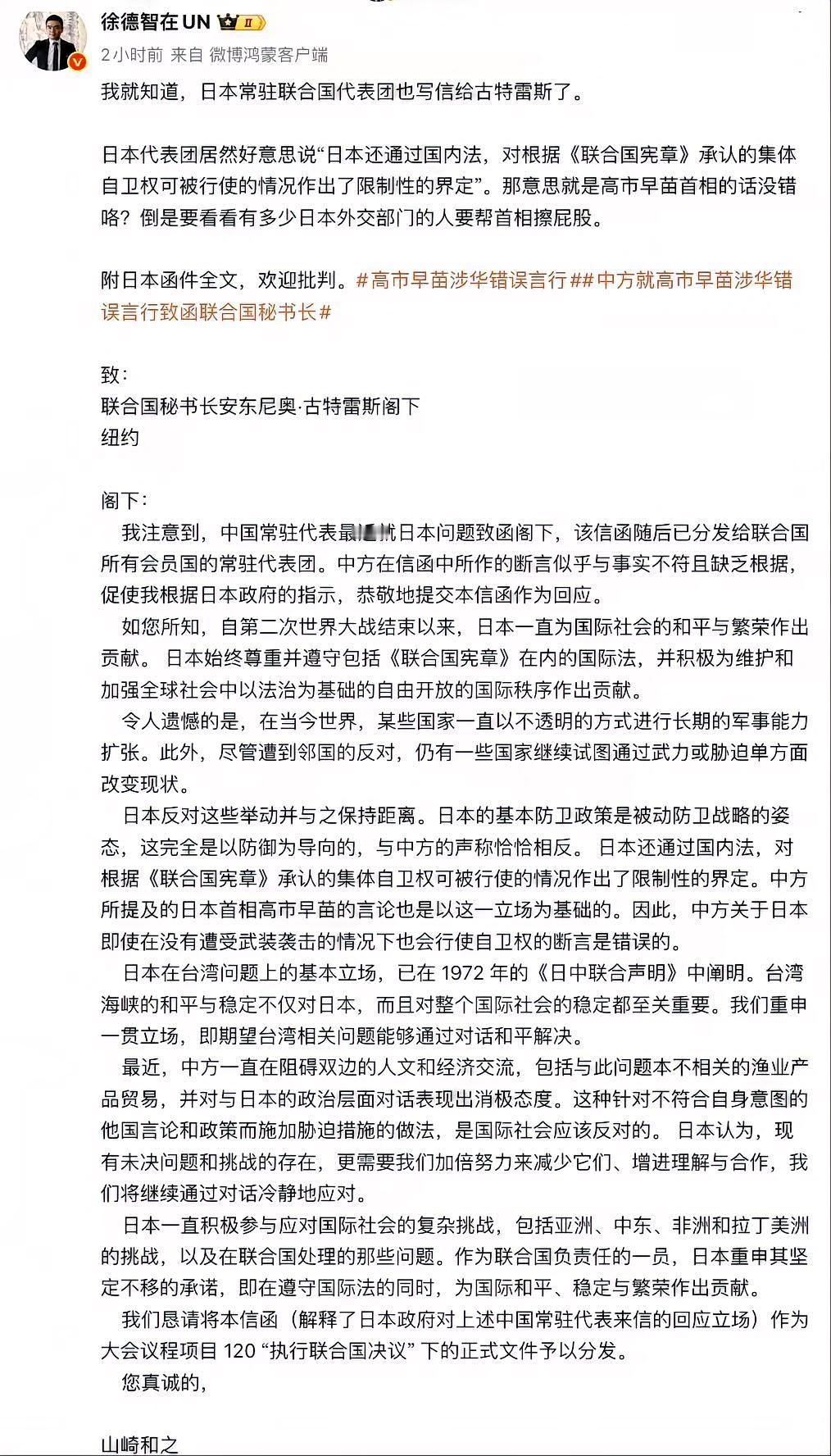 中方刚给联合国致函亮明态度,日方就急着递信辩解,说咱“反应过度”,还扯什么军事透明度、遵守国际法,简直是欲盖弥彰! 别真以为这是高市早苗一个人的口无遮拦,从政府下场辩解的架势就能看出来,这分明是日方的集体共识。王毅外长早就点出了他们的“两宗罪”:说错了话,更越了不该越的红线。 作为二战战败国,本该在台海问题上谨言慎行,结果不仅公开挑衅,被反击了还拒不认错。所谓的“遵守国际法”,不过是他们掩盖军国主义抬头野心的幌子。 中方都把话挑明了,不会允许域外势力染指台湾,更不会放任日本开历史倒车。现在日方的态度已经很清楚:不想道歉,只想蒙混过关。 所以别再抱有任何幻想,对付这种避重就轻、毫无诚意的挑衅,唯有拿出强硬姿态守住底线。你觉得日方拒不认错,接下来还会有什么小动作?来评论区聊聊!