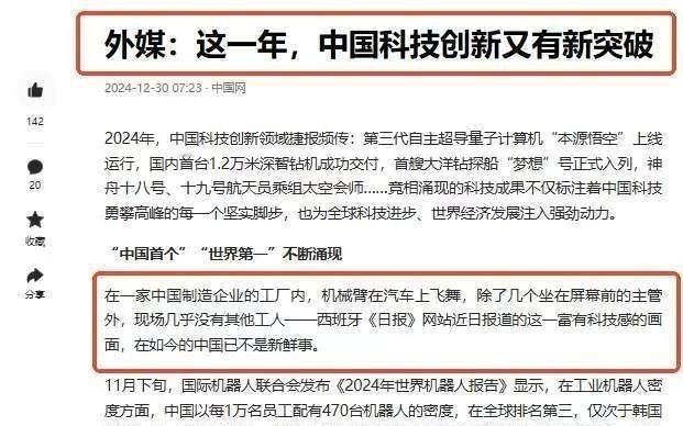 风向真的变了,很多外媒已经有所觉察!包括美国、德国、英国、巴西、新加坡以及俄罗斯等国外媒体纷纷将目光投向中国,他们惊讶地发现中国科技在过去的一年又发生了实质性的变化,看来中国科技崛起的信号越来越明显了! 2024年9月26日,世界知识产权组织在瑞士日内瓦发全球创新指数报告,中国排第11,比去年升一位,在133国中是唯一中收入经济体进前30。耶鲁大学教授在新泽西实验室推电脑显示器,看从2010年第43到现在的曲线陡升,转鼠标放大图表,对助理比增长率,点出15年投入力度。俄罗斯塔斯社编辑在莫斯科办公室敲键盘,写中国研发预算年年涨,高科技出口在中低收入组占比最高,屏幕复制数据表,标向技术主导转型迹象。报告显示,中国有26个科技集群进全球百强,领跑亚洲,美国次之。 航天成就让巴西媒体驻京记者多看几眼。4月25日,神舟十八号从酒泉发射,长征二号乙火箭升空,载叶光富、李聪、李广苏三人上天宫空间站,任务六个月,换下神舟十七乘组。他们在轨做两到三次出舱活动,5月28日第一次出舱八小时半,创中国单次纪录,安装微流星体防护盾,7月3日第二次出舱加固管道电缆。空间站内,他们操作离心机分离样本,记录蛋白晶体生长,调整显微镜观细胞变。巴西环球网记者在里约办公室暂停视频,放大航天员身影,笔记记中国实验盖生物适应 和材料测试,已达国际水平。神舟十八11月3日返回,驻留183天,完成大量空间科学实验。 月球探测拉动德国记者走访。5月3日嫦娥六号从文昌发射,长征五号火箭入轨,6月1日陆南极-艾特肯盆地,钻挖岩土样本1935克,6月25日返回内蒙古,全球首份月背样本。北京实验室,科研员戴护目镜放样本进真空腔,扫描仪转,屏幕现微米级赤铁矿颗粒,转旋钮记氧化层厚,此发现颠覆月背低氧认知,揭月幔材料和远近侧差异。德国明镜周刊记者到场,笔记本开,李瑞指显微镜图,解撞击高温释氧气,记者速记术语。新加坡海峡时报编辑办公室围桌,放分析视频,议这项填月地质空白,推动国际合作。样本示火山活动持续14亿年,古磁场反弹2.8亿年前。 四川稻城高原,拉索观测站阵列雾中立,团队两年数据锁银河五处微类星体,黑洞吞伴星喷粒子,破“膝”结构谜70年。观测员五千米平台裹棉衣,风雪拧探测器螺,手指僵校准角。英国卫报伦敦工作室审彩图照,标题重中国粒子物理贡,喝咖啡写稿,指观测重塑宇宙加速器模。11月16日,拉索发里程碑结果,解膝成因,联黑洞喷流源,高纯质子谱测准卫星级,铁峰9.7 PeV超25.9σ置信。 新能源,中国1 至10月电动车产977万,渗透45.8%,深圳工厂流水线工固定电池模,机械臂焊火花溅,车下线卡车运港。巴西圣保罗记者码头访,记电动车主拉美出口。内蒙古阿拉善沙漠,1月11日兆瓦级高空风电示范发电,伞梯组合,伞缆飞三百米高,氦球升拉缆,地发电机转低鸣。俄罗斯RT电视台无人机盘,播手持话筒述,技降成本三成,开高空风能时。中国2024风电装机增,超高空项目安20台五兆瓦涡轮,最高5200米,全球纪录。 沪东造船厂,076型四川舰12月27日下水,舷51,满载四万吨,双岛全长甲板,电磁弹射和阻拦索,载固定翼无人GJ-11、WZ-7,直升和两栖装备。11月14日解缆出港,海试三天,桥官兵转舵,浪击船身,前岛监仪表,后岛调甲板,弹射测火光闪,无人滑轨速升。德国法兰克福汇报柏林审航拍,认中国融电磁技,提升两栖作战。伊朗媒体德黑兰小报标预测,中国融优后,领全球研发支。 美国CNN华盛顿演播室,滚中国PCT申请世界第一,2024年70160件,华为主力6600件,超三星。有效发明专利超四百万,AI新能源核技储备。德国机构报,中国新兴产业育传统升并行,自布局转主。巴西新加坡媒体转专利视频,评区涌议,中国从制造转创新引擎。俄罗斯专家电视访,手展指数图,强协同模注活力。外媒报渐衡,过去制造标退,“创新力”认知温。2024,中国出口高科技产升,中等收入国领,全球技术主导趋明。 这些进展非偶然,PCT申请稳首,专利支关键域。外媒如BBC注AI+推产业变,腾讯百度高校合,技转应用快。CNN点新能源销量世界第一,5G普,CR450动车领高铁。德国明镜赞嫦娥六揭氧化机,罕见国际。巴西环球网评神舟十八刷纪录,空间实验规模大。俄罗斯塔斯社写拉索解膝谜,黑洞源连。黄仁勋2024访华,承认中国AI赢赛可能,低能耗松规助。耶鲁专家叹15年跃升惊人。新加坡海峡时报议月样本填空白,推合作。