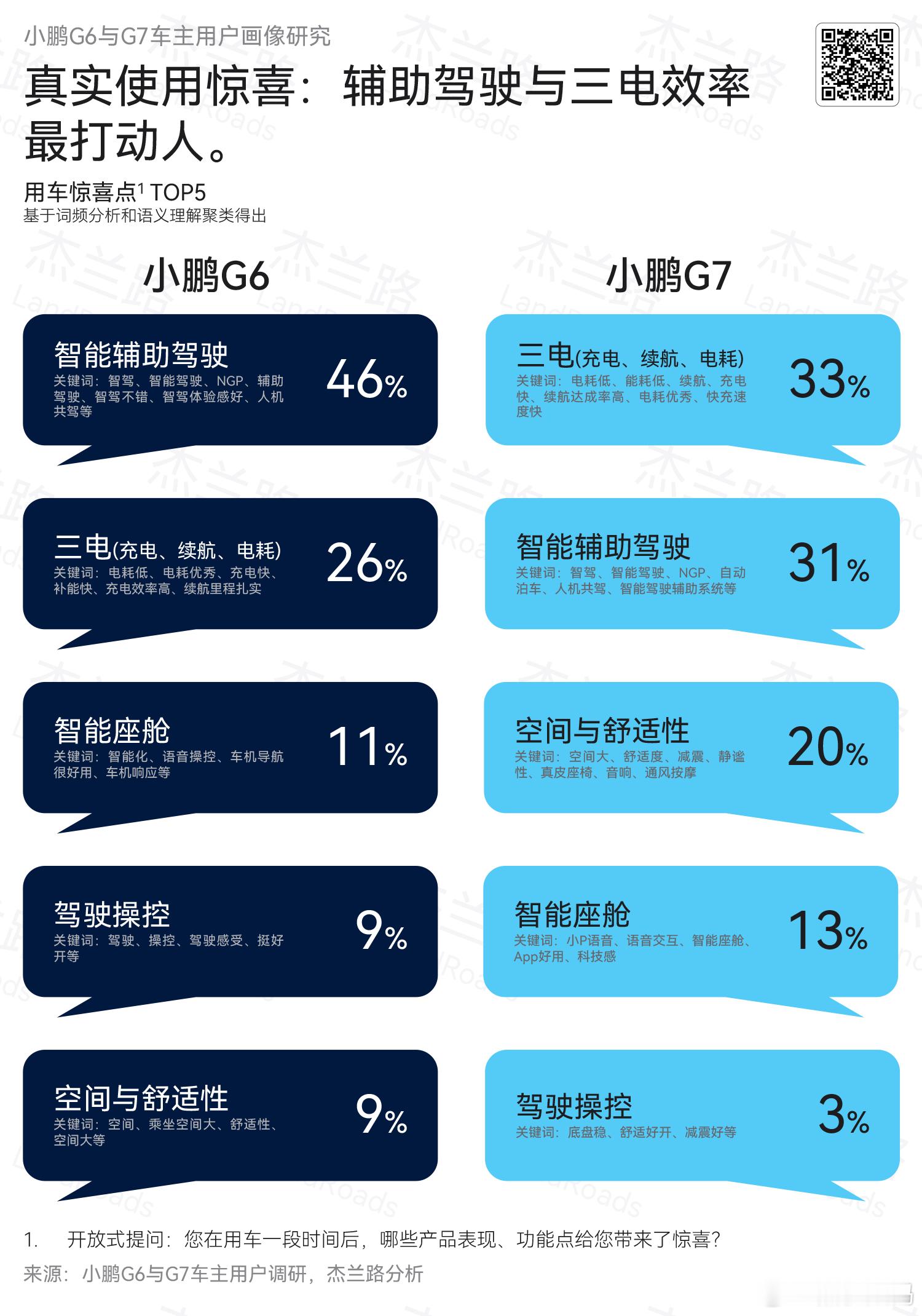 “新智家庭”成为购车主力,由“好用的智能驾驶辅助、高效稳定的三电、舒适大空间”组成的新三大件是核心购车标准。两车的用户都是年轻、高知、稳健的初成新智家庭,“新三大件”是这些用户最满意的地方,其中智驾、续航是最打动他们的产品卖点。凭借领先的智能化和三电,小鹏G7以及小鹏G6在25年第三季度15-25万元区间纯电SUV销量中占据第五以及第六位,且智能化配置丰富度指数均超过94%,稳居第一梯队。